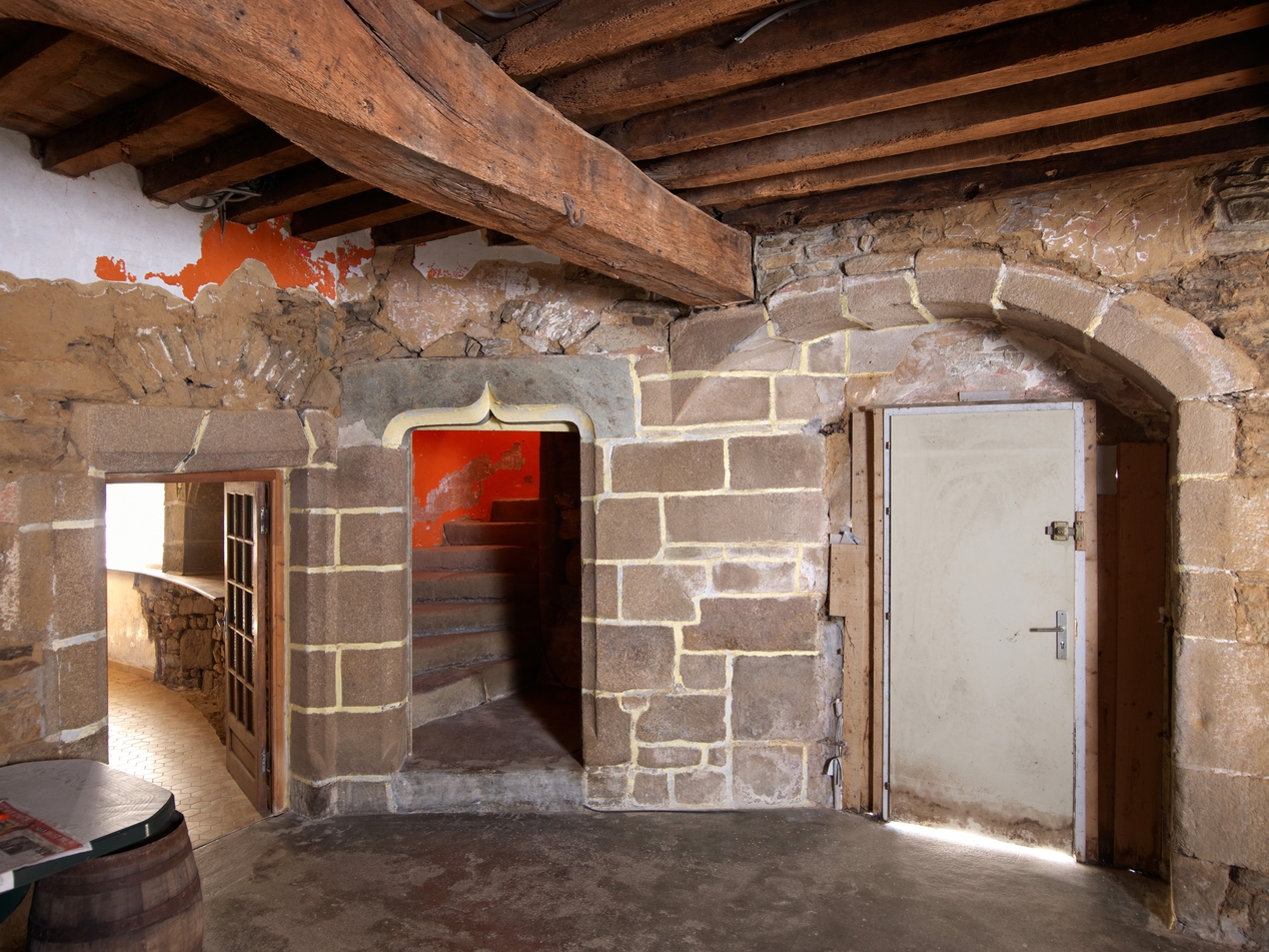 Salle du rez-de-chaussée : portes d'accès à la cuisine, tour d'escalier et entréeImmatriculation