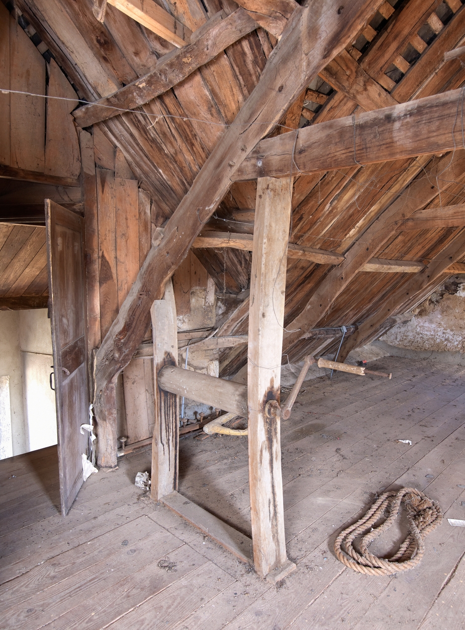 Comble : treuil permettant de monter les sacs de grains au grenier grâce à la trappe aménagée dans le plancherImmatriculation