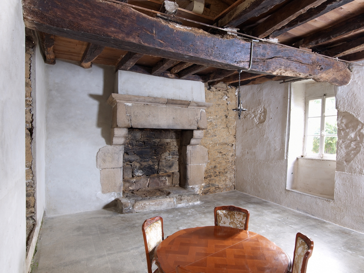 Rez-de-chaussée, salle basse sud actuellement désaffectée, cheminée monumentale et poutraisonImmatriculation