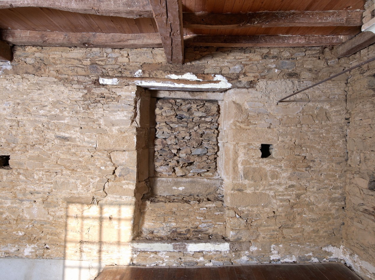 Premier étage, salle sud actuellement désaffectée (à usage probable de chambre), fenêtre donnant vers l'est muréeImmatriculation