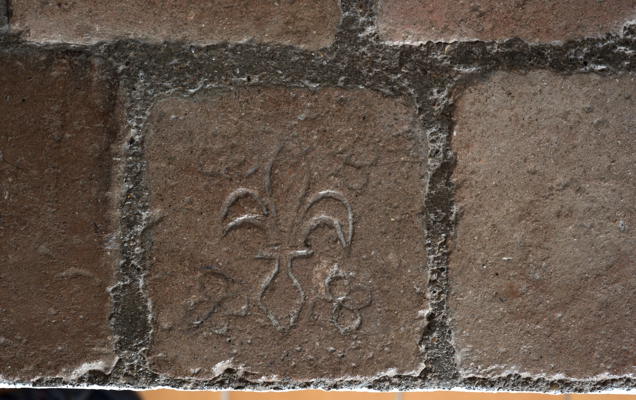 Détail du décor des carreaux en terre cuite, fleur de lys entouré de quatre quartefeuillesImmatriculation