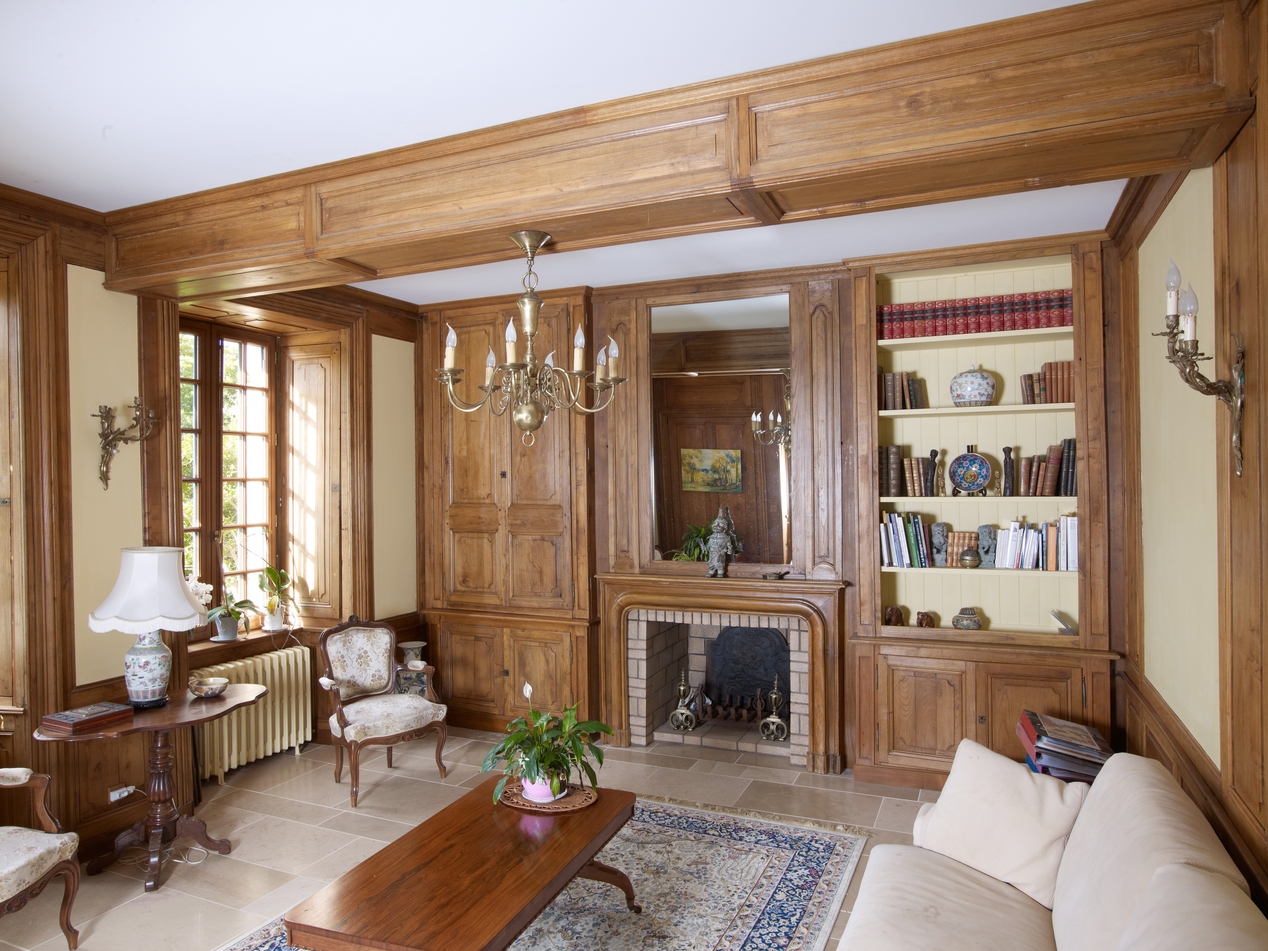 Rez-de-chaussée, salle basse à usage actuel de salon, cheminée et boiseries reconstituées (fenêtre donnant vers le sud)Immatriculation