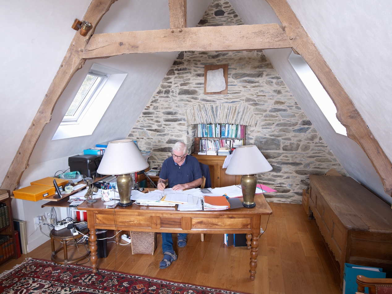 Partie nord du logis, étage de comble à usage actuel de bureau, mur de refend et charpente. Sur la photographie, Michel Boussu, propriétaireImmatriculation