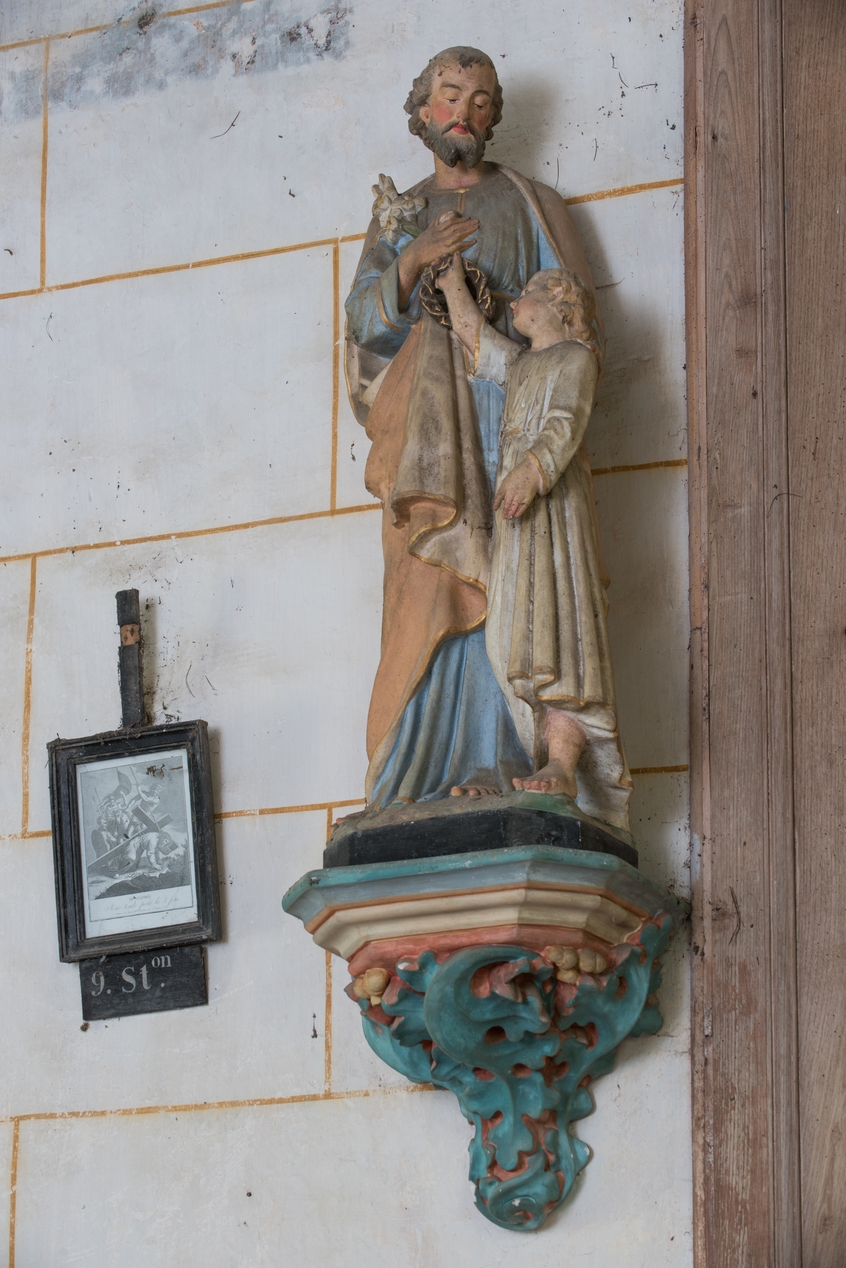 Statue en plâtre polychrome de Saint-Joseph à l'Enfant sur une applique en plâtre peint, vue latérale droite (genre Saint-Sulpice).Immatriculation