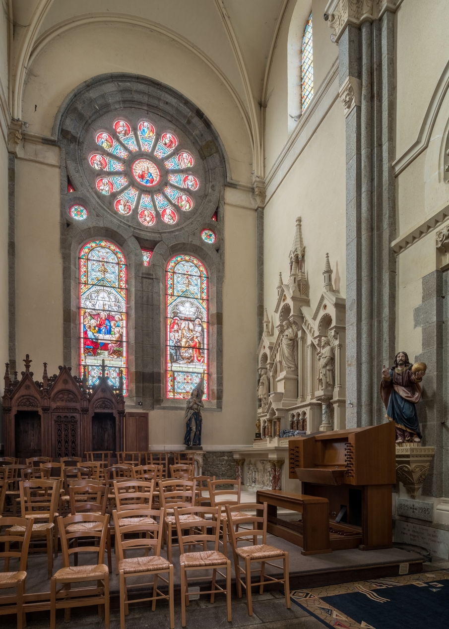 Vue de la croisée du transept vers l'autel et les vitraux du bras du transept ouest.Immatriculation