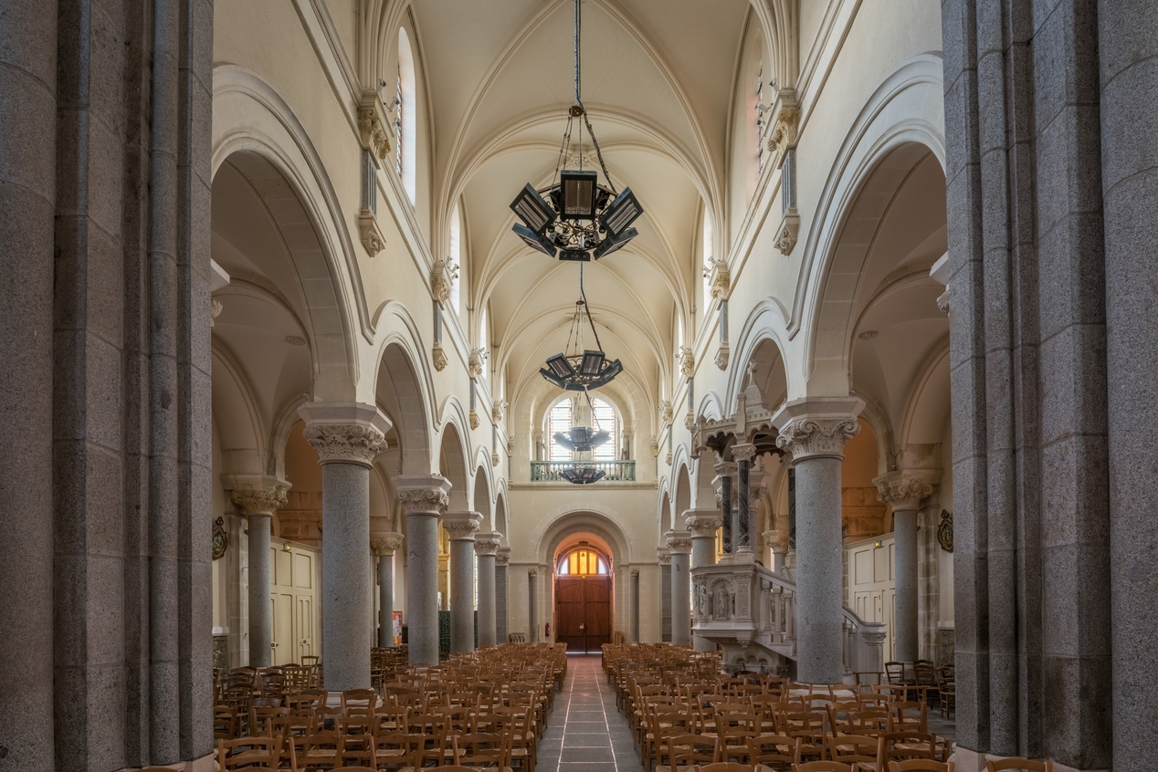 Vue rapprochée du vaisseau centrale vers l'entrée principale avec la chaire à prêcher en stuc.Immatriculation