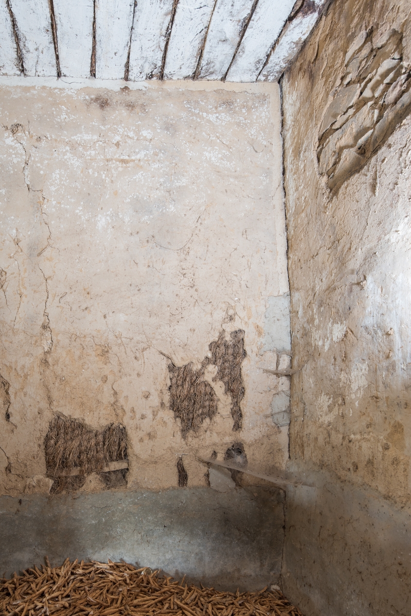 Logement de domestique aménagé dans la grange. Chambre de l'étage. Détail de la cloison en pan de bois et torchisImmatriculation