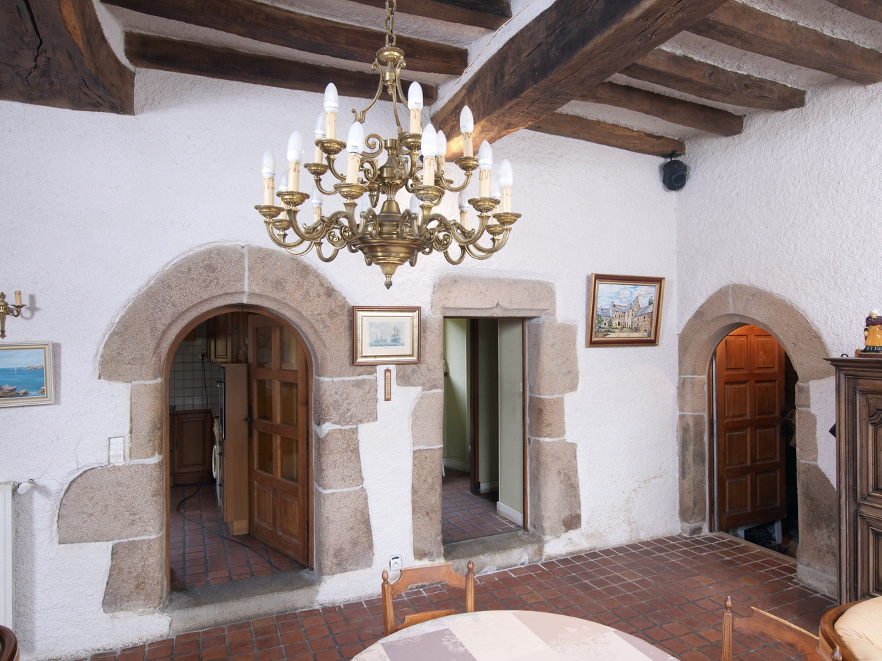 Minihy-Tréguier : manoir de Saint-Renaud, cuisine orientée est-ouest, portes du mur nord (arc plein cintre et linteau droit à accolade). A droite, porte en arc plein cintre donnant sur le cellierImmatriculation