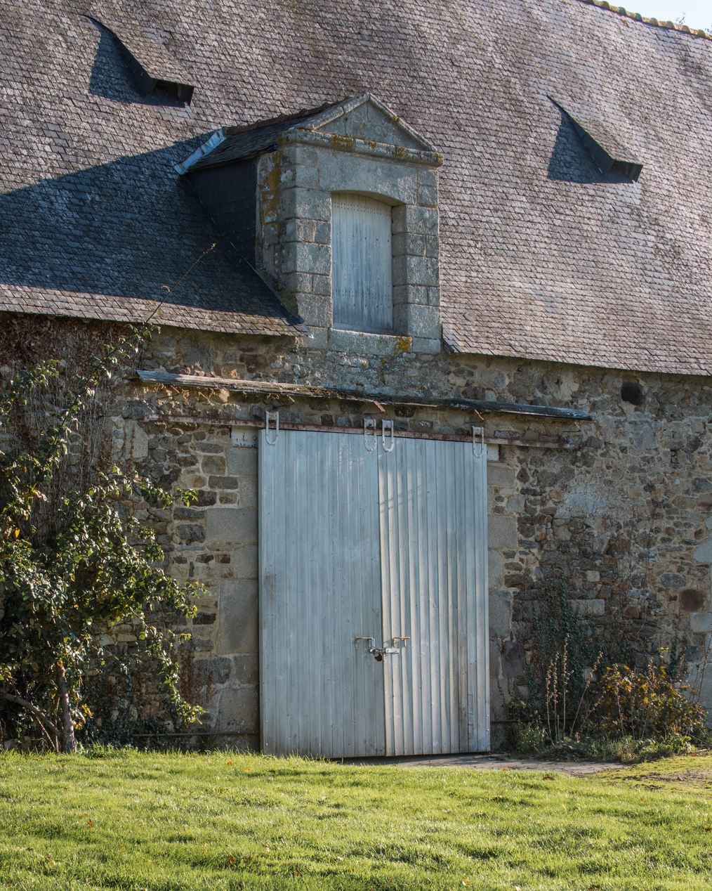 Entrée centrale des dépendances permettant d'accéder à la remise à carrosse (date sculptée dans le fronton triangulaire ?).Immatriculation