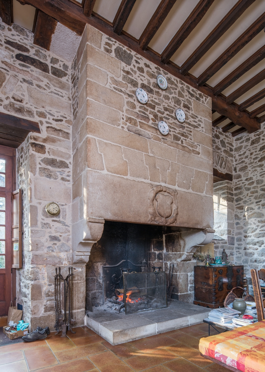 Cheminée monumentale au linteau armorié qui devait arboré les armes de la famille Thomas de la Caunelaye, sur le pignon ouest.Immatriculation