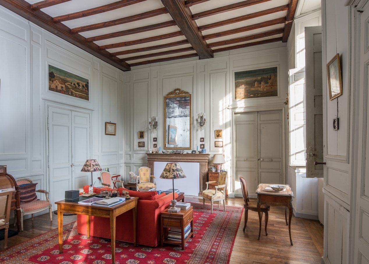Premier salon de l'aile est au rez-de-chaussée : salon aux boiseries du 18e siècle avec des panneaux peints en imposte.Immatriculation