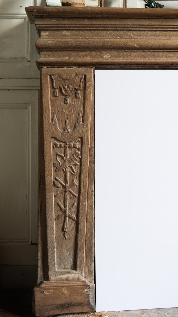 Détail du coffrage en bois de la cheminée dans le salon de l'aile est.Immatriculation