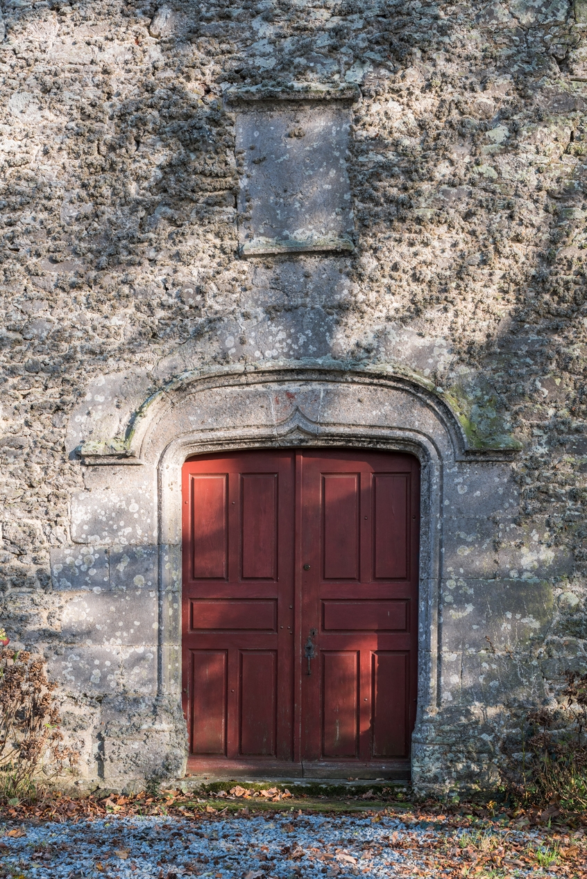 Vue frontale de la porte à arc en anse de panier et à accolade. Le cadre au-dessus accueillait les armoiries qui ont été bûchées.Immatriculation