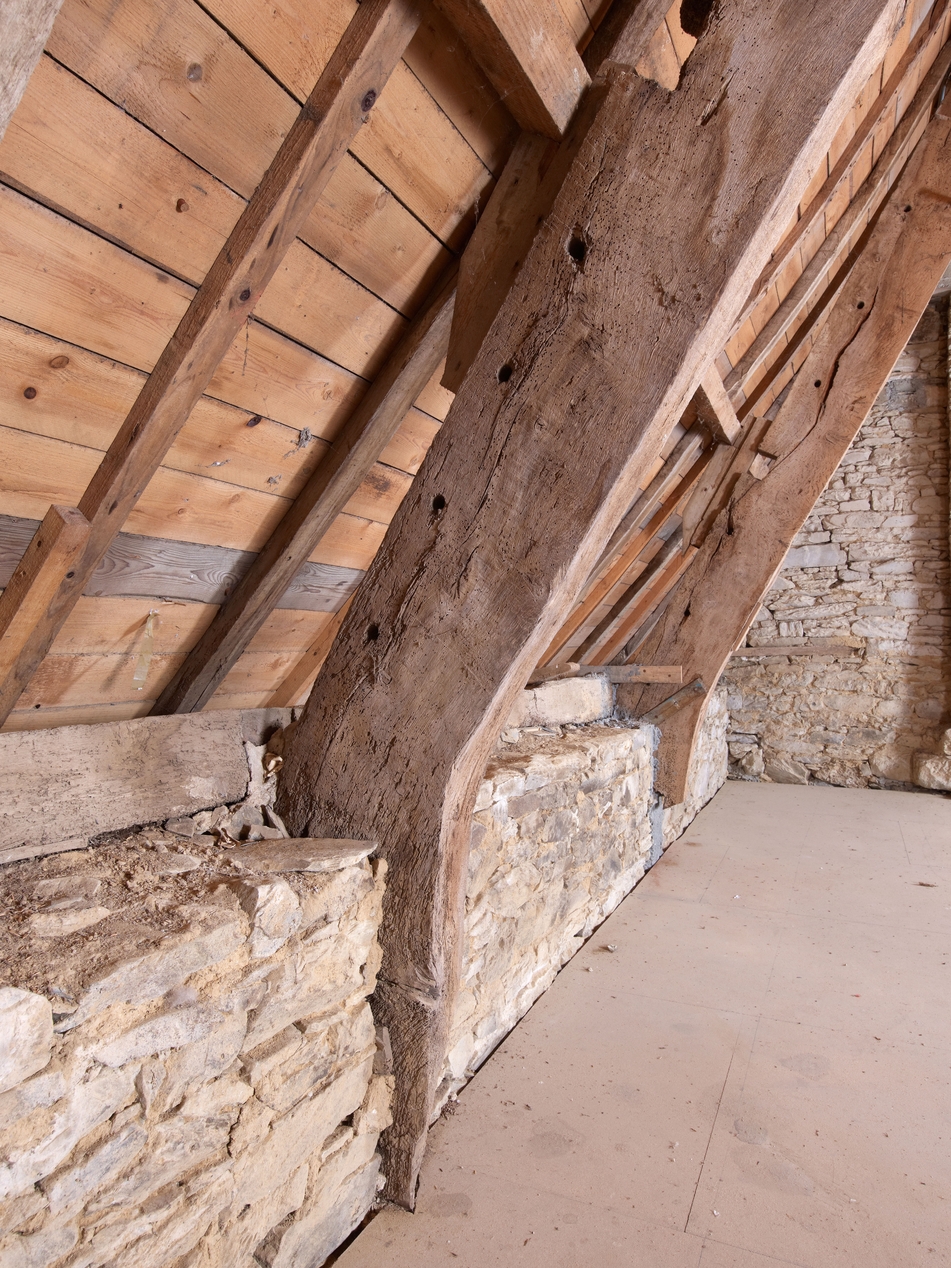 Minihy-Tréguier : manoir de Saint-Renaud, étage de combles, charpente, détail de l'un des arbalétriers courbesImmatriculation