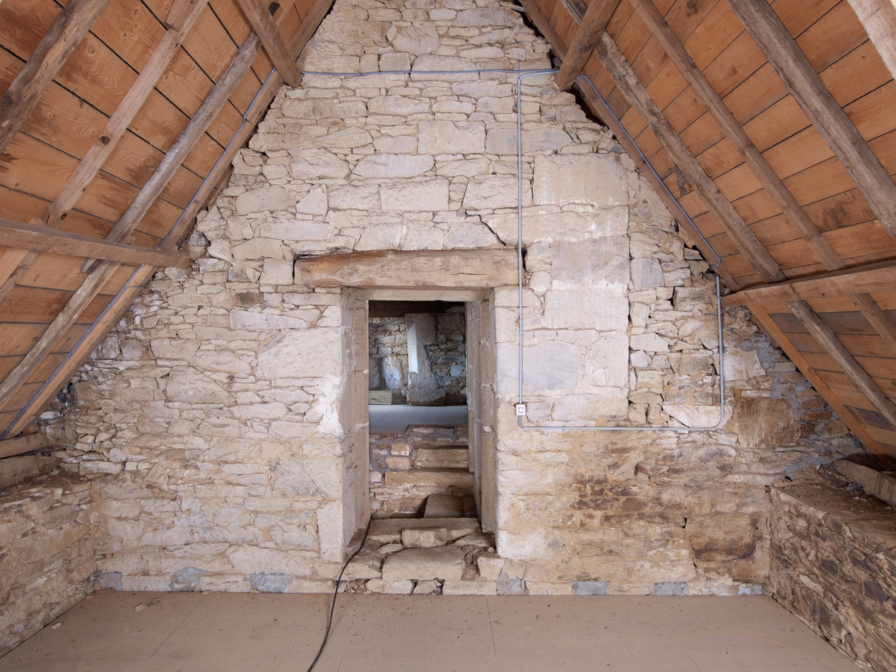 Minihy-Tréguier : manoir de Saint-Renaud, étage de comble, mur de refend situé entre l'aile sud et l'escalier, détail de la face sud, traces d'un "décrochement" dans le murImmatriculation