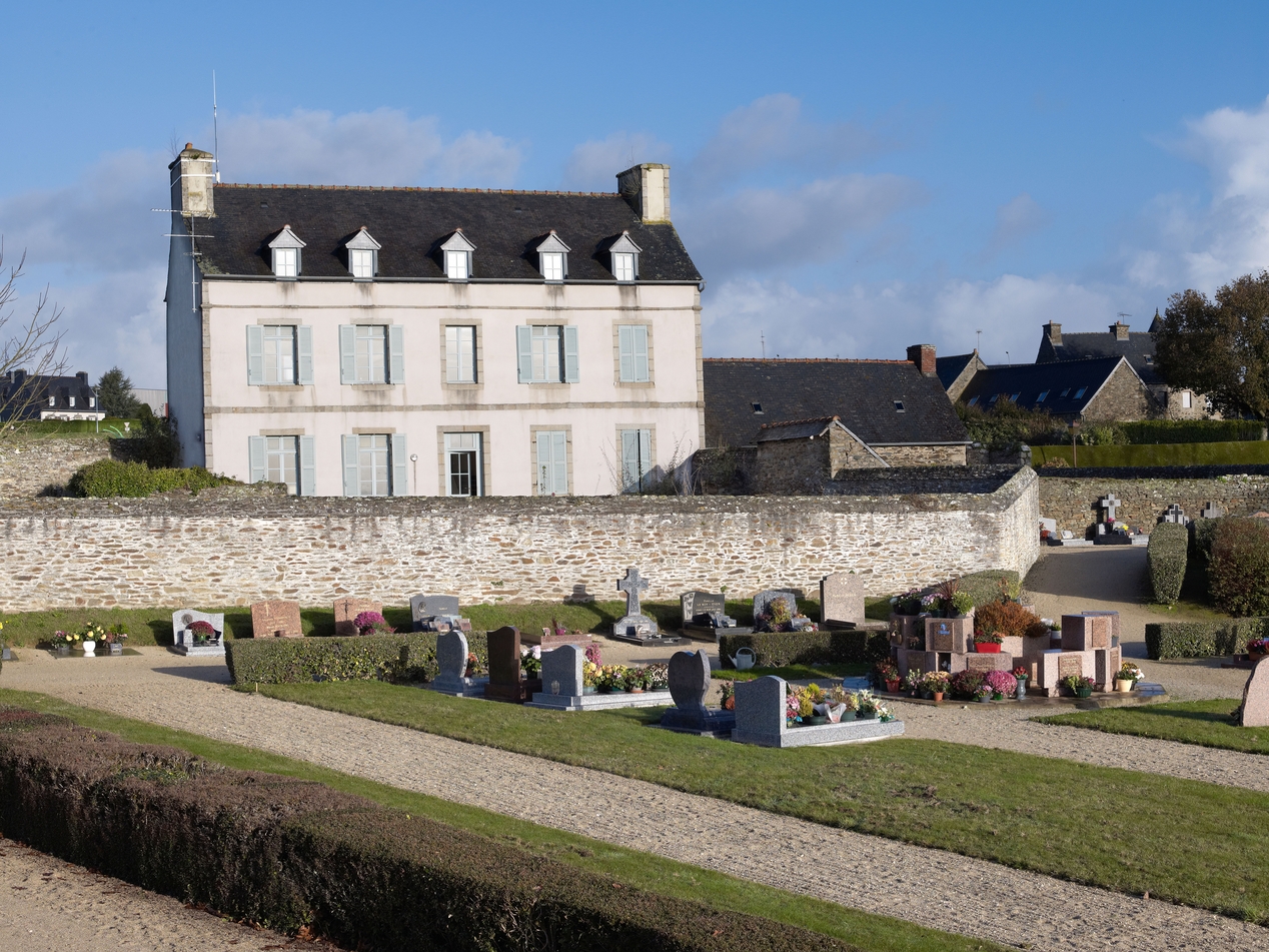 Minihy-Tréguier, 3 rue de l'Église : presbytère actuellement logement, vue de situation depuis le sud. Au premier plan, l'extension du cimetièreImmatriculation