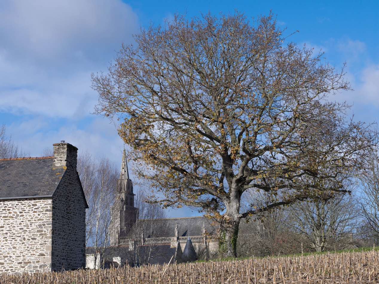 Minihy-Tréguier, 23 rue du Bourg : maison (ancienne ferme ?). En arrière-plan derrière le chêne, l'église Saint-YvesImmatriculation