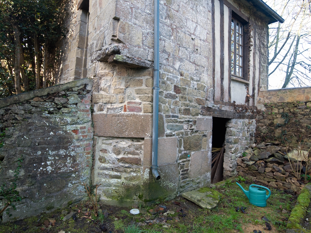 Tréguier, 12 rue Colvestre : pavillon de jardin, façade est-nord-est avec partie en pan de bois, détail de l'ouverture d'angle surmontée d'armoiriesImmatriculation