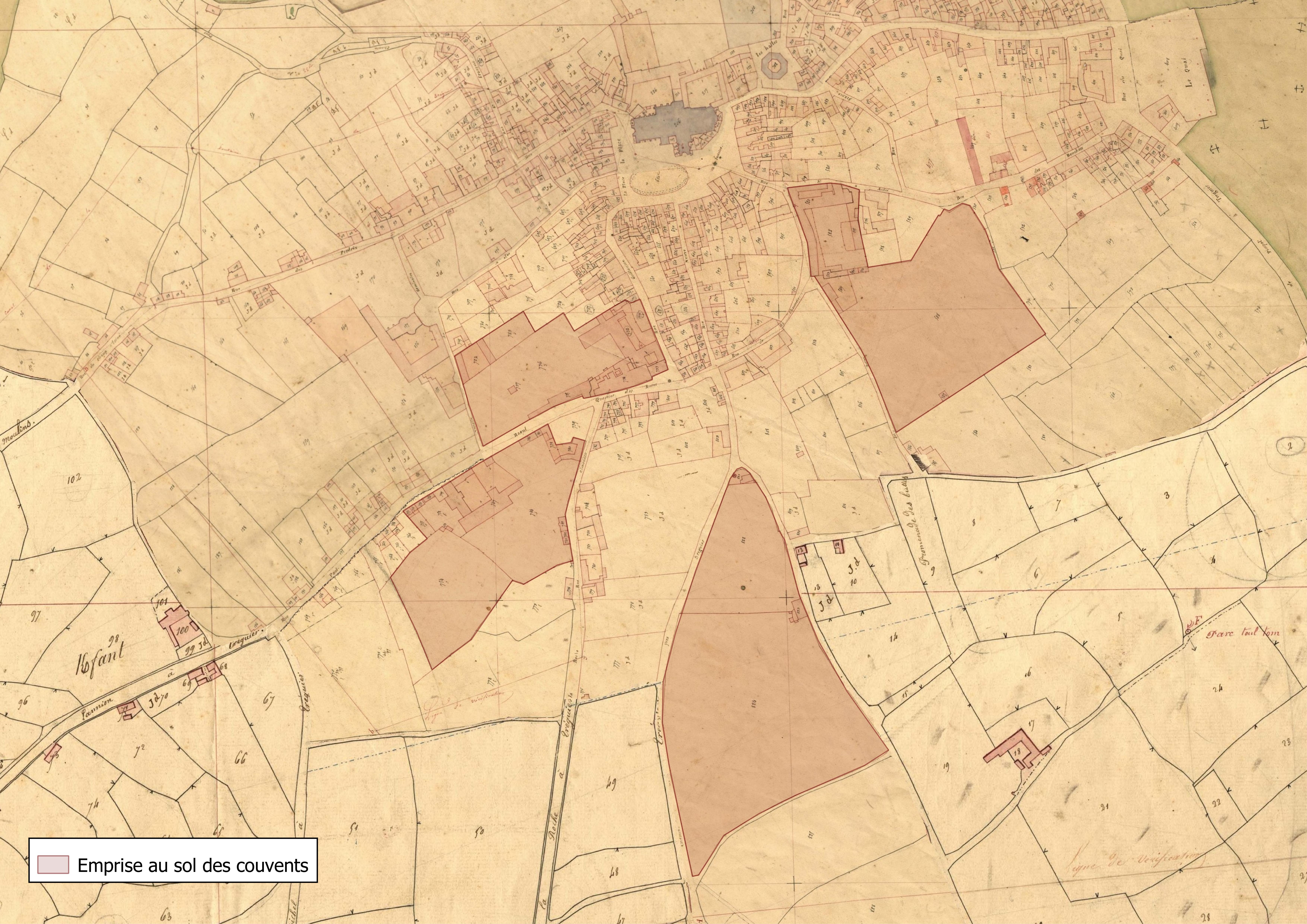 Emprise au sol des couvents en 1834. Extrait du cadastre ancien, sections A1 et A2 (A.D.22, série 3 P 367/1)Immatriculation