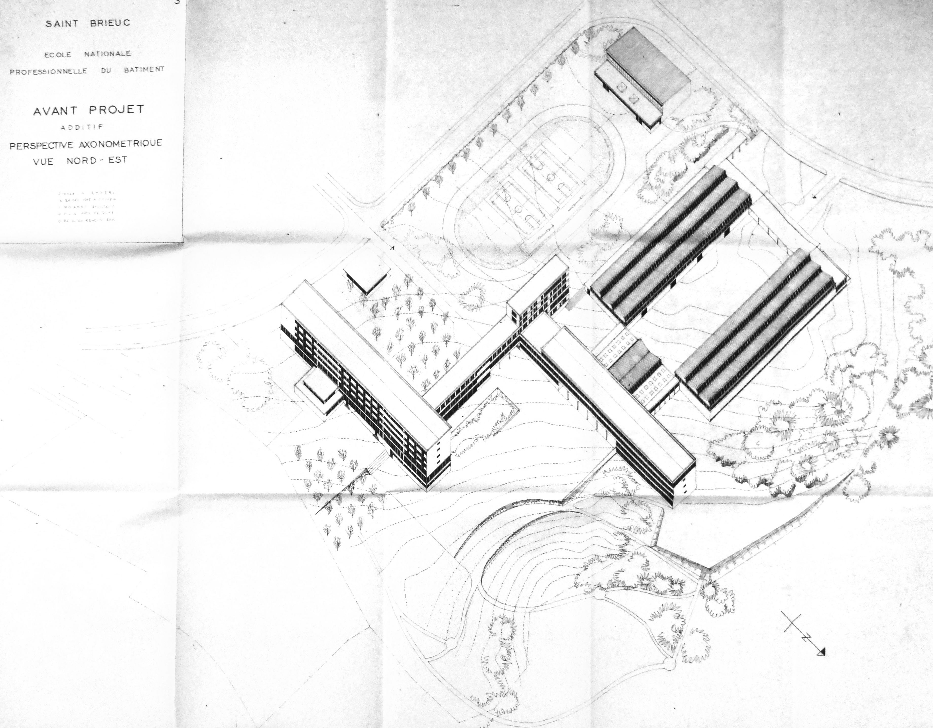 AD Ille-et-Vilaine : 243 W 37. Perspective axonométrique vue nord-est. Y. Moignet, 1960.