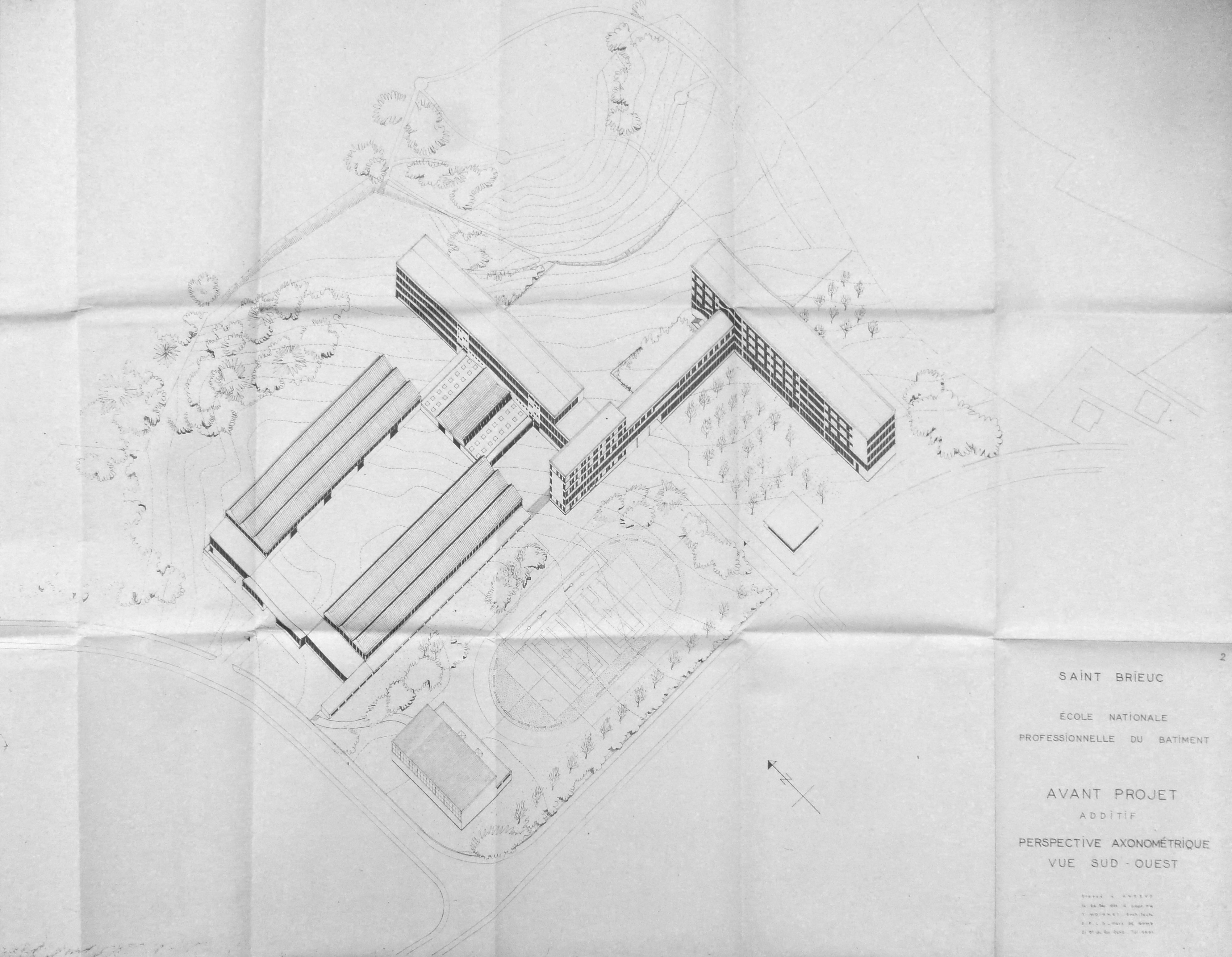 AD Ille-et-Vilaine : 243 W 37. Perspective axonométrique vue sud-ouest. Y. Moignet, 1960.