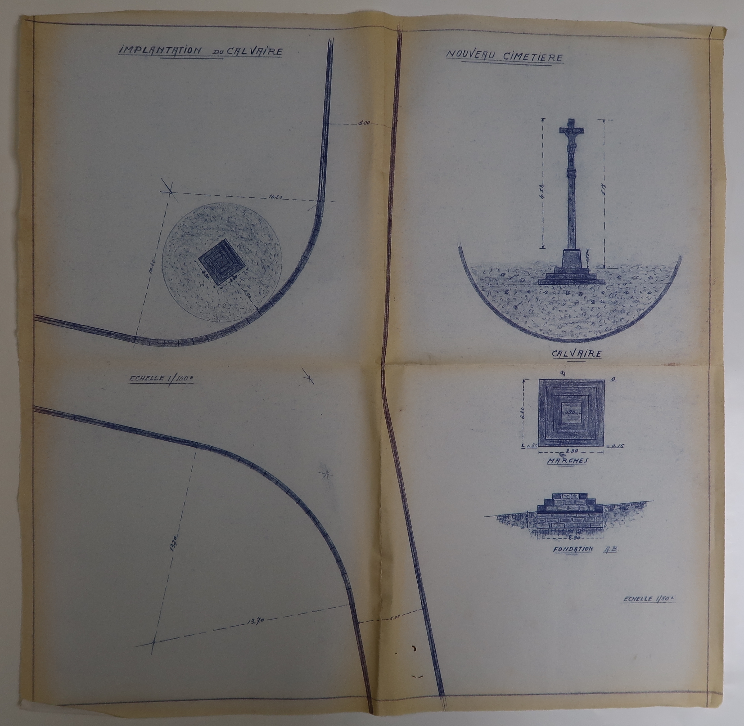 Tréguier : plan d'implantation et élévation de la croix du cimetière du Bilo, vers 1963-1966 (?) (Archives municipales de Tréguier, 2M4)Immatriculation