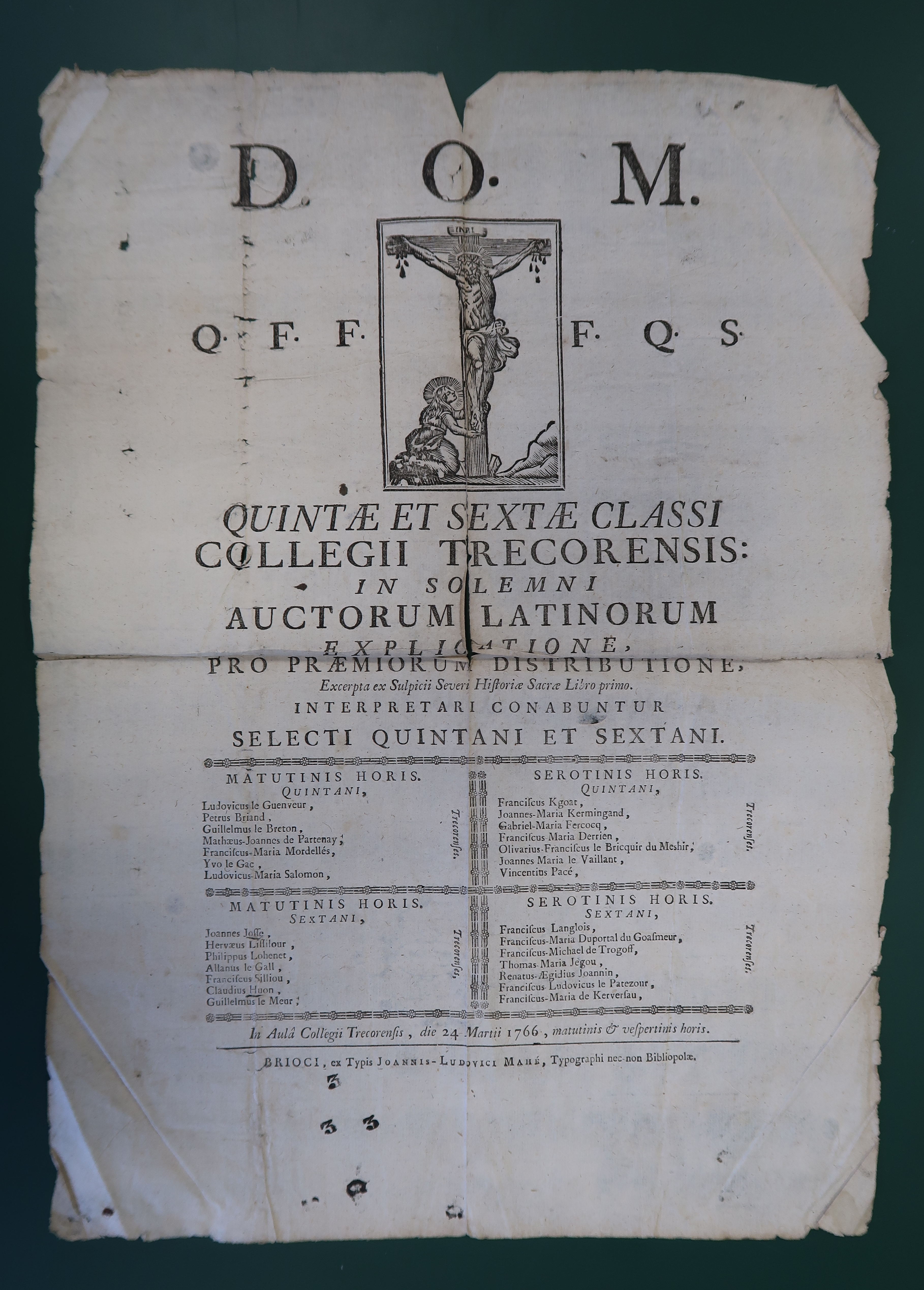 Tréguier : remise des prix du Collegii Trecorensis (collège de Tréguier dit collège diocésain), 24 mars 1766 (Collection de la bibliothèque du collège Saint-Joseph de Lannion)Immatriculation