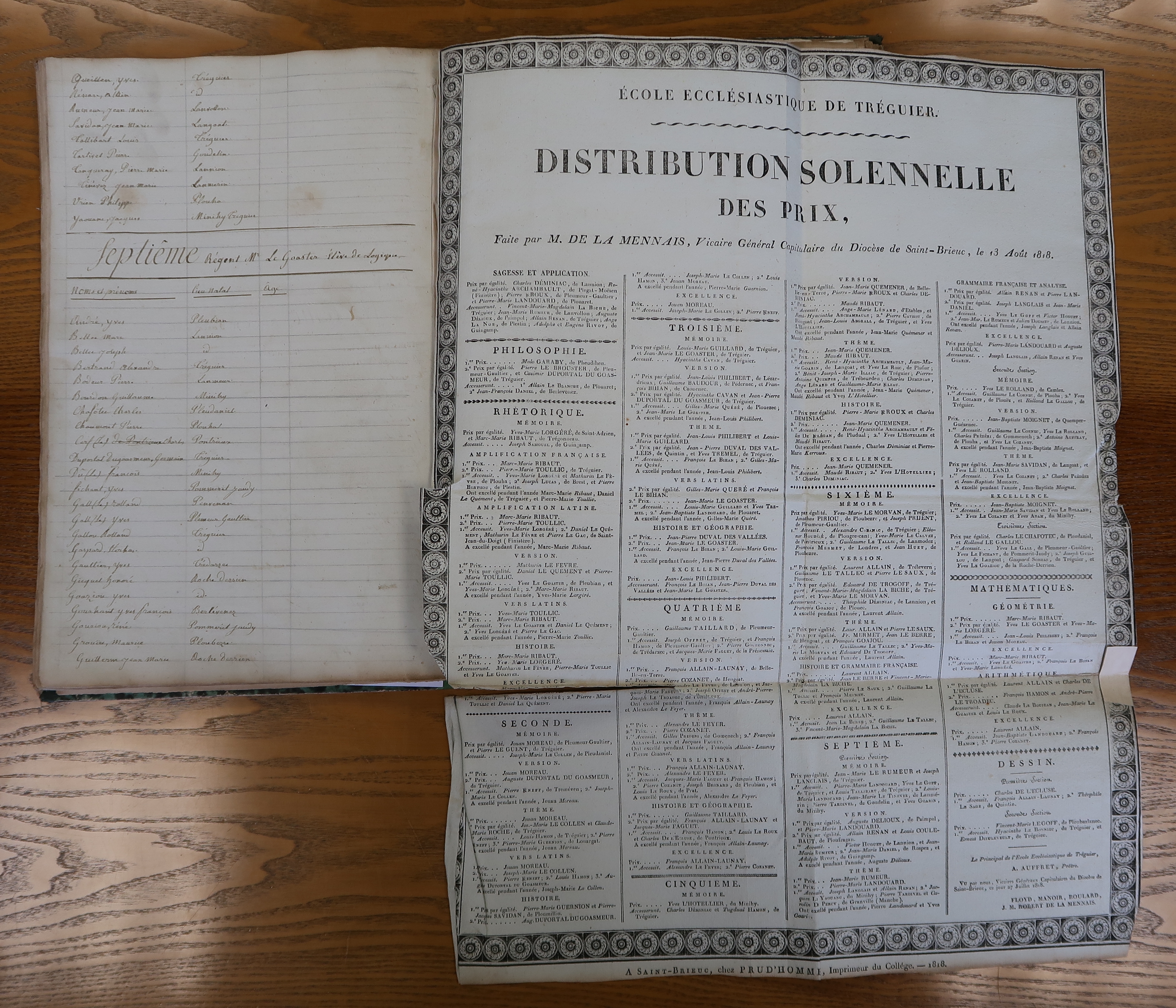 Tréguier : archives de l'école ecclésiastique, distribution solennelle des prix, 1818 (Collection de la bibliothèque du collège Saint-Joseph de Lannion)Immatriculation