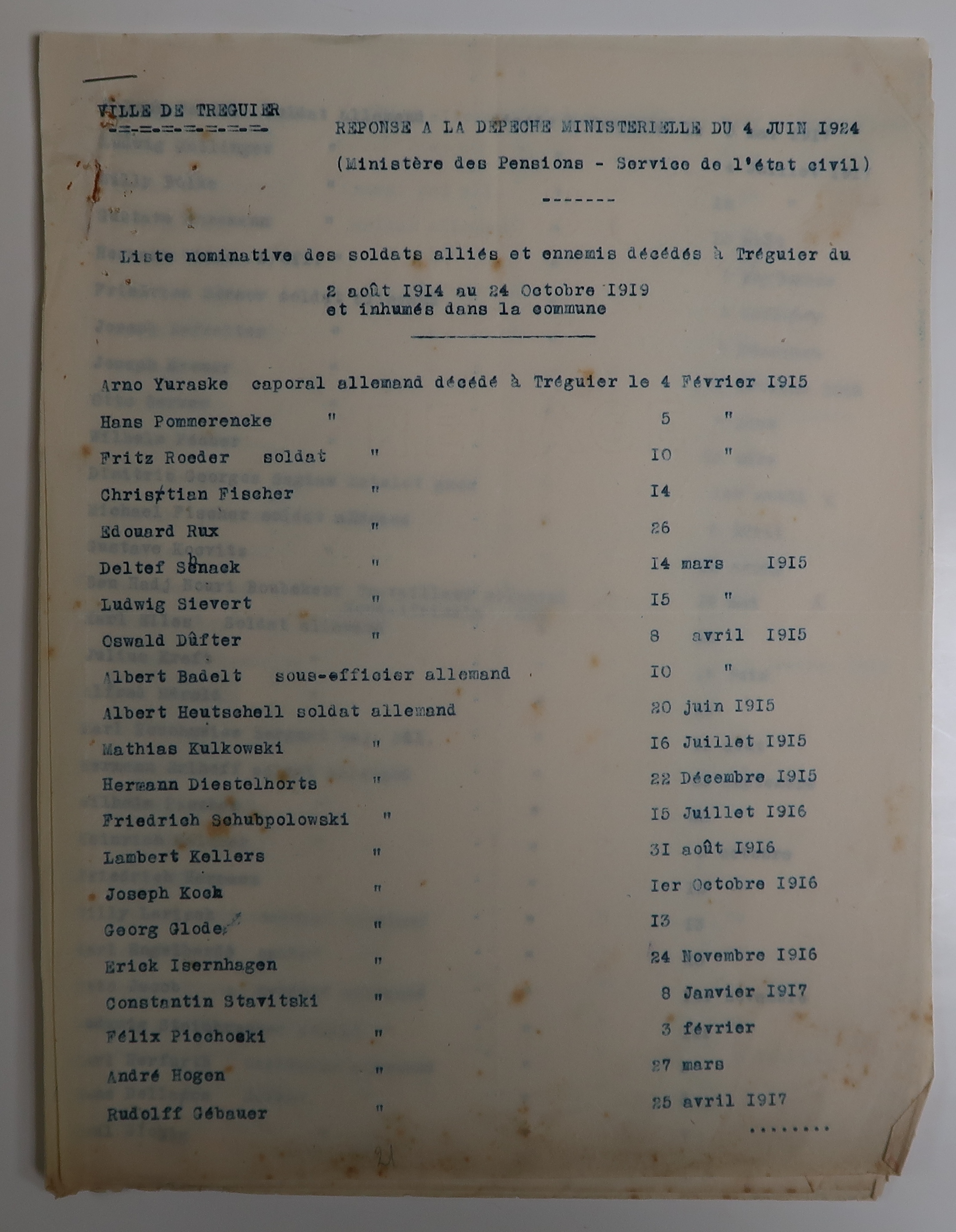 Tréguier, cimetière Saint-Fiacre et carrés militaires français et allemands : liste nominative des soldats alliés et ennemis décédés à Tréguier du 2 août 1914 au 24 octobre 1919 et inhumés dans la commune, 7 juin 1924 (Archives municipales de Tréguier, 4H46)Immatriculation