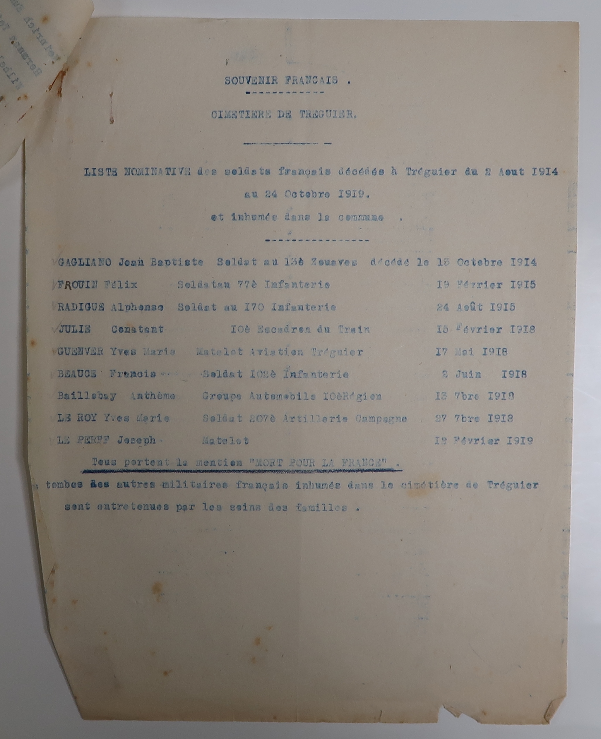 Tréguier, cimetière Saint-Fiacre et carrés militaires français et allemands : liste nominative des soldats français décédés à Tréguier du 2 août 1914 au 24 octobre 1919 et inhumés dans la commune, 7 juin 1924 (Archives municipales de Tréguier, 4H46)Immatriculation