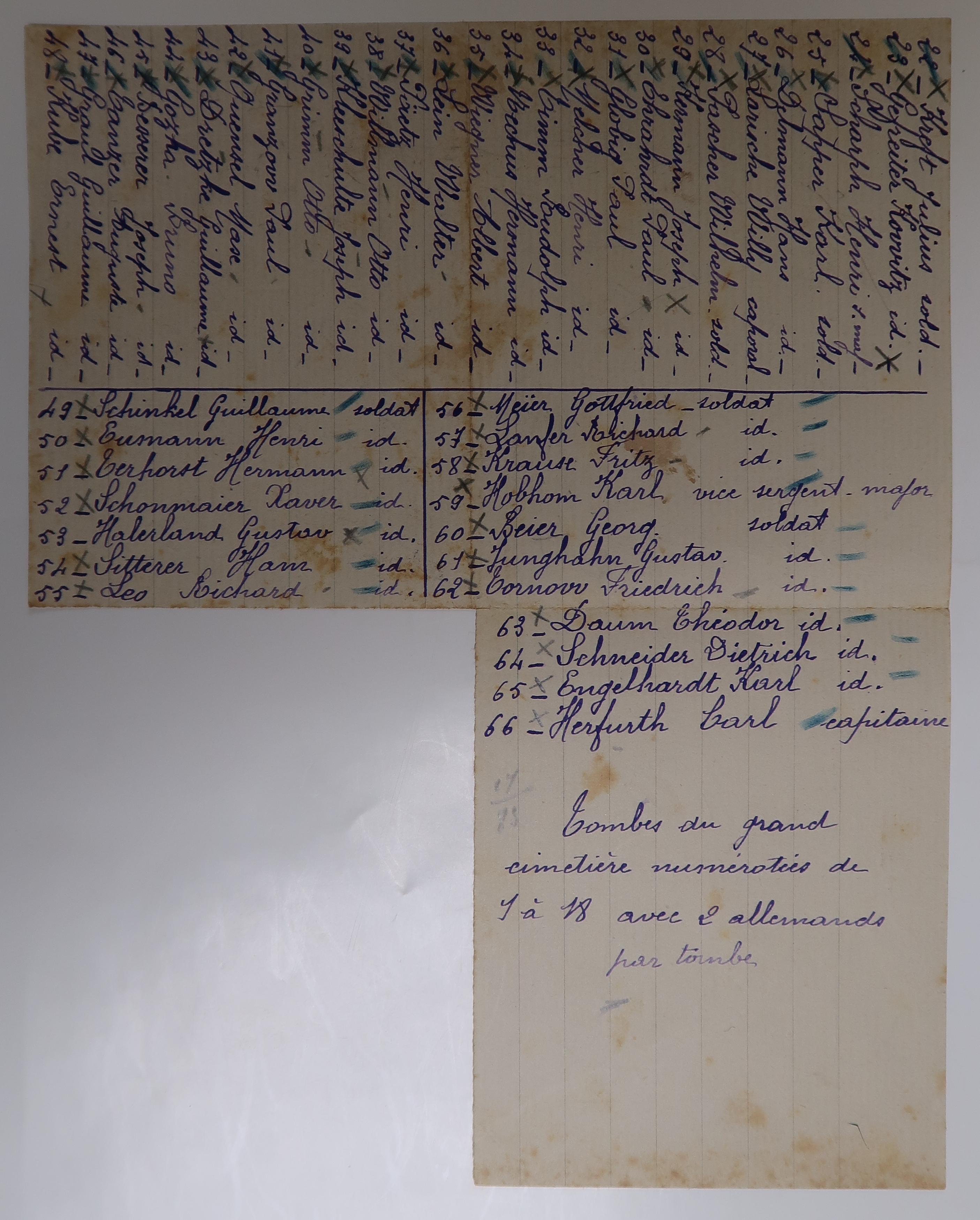Tombes de soldats allemands ; recensement et entretien : correspondance avec le Souvenir français, correspondance avec le Volksbund Deutsche Kriegsgräberfürsorge, correspondance diverse, liste nominative [soldats inhumés dans la commune entre le 2 août 1914 et le 24 octobre 1919 : 9 français, un nord-africain, 83 allemands et un grec], plans, dossiers de translation de corps irrégulièrement inhumés dans le carré militaire, attestation d’exhumation de 5 corps, dossier d’invitation à la cérémonie de remplacement des croix. 1935-1979.