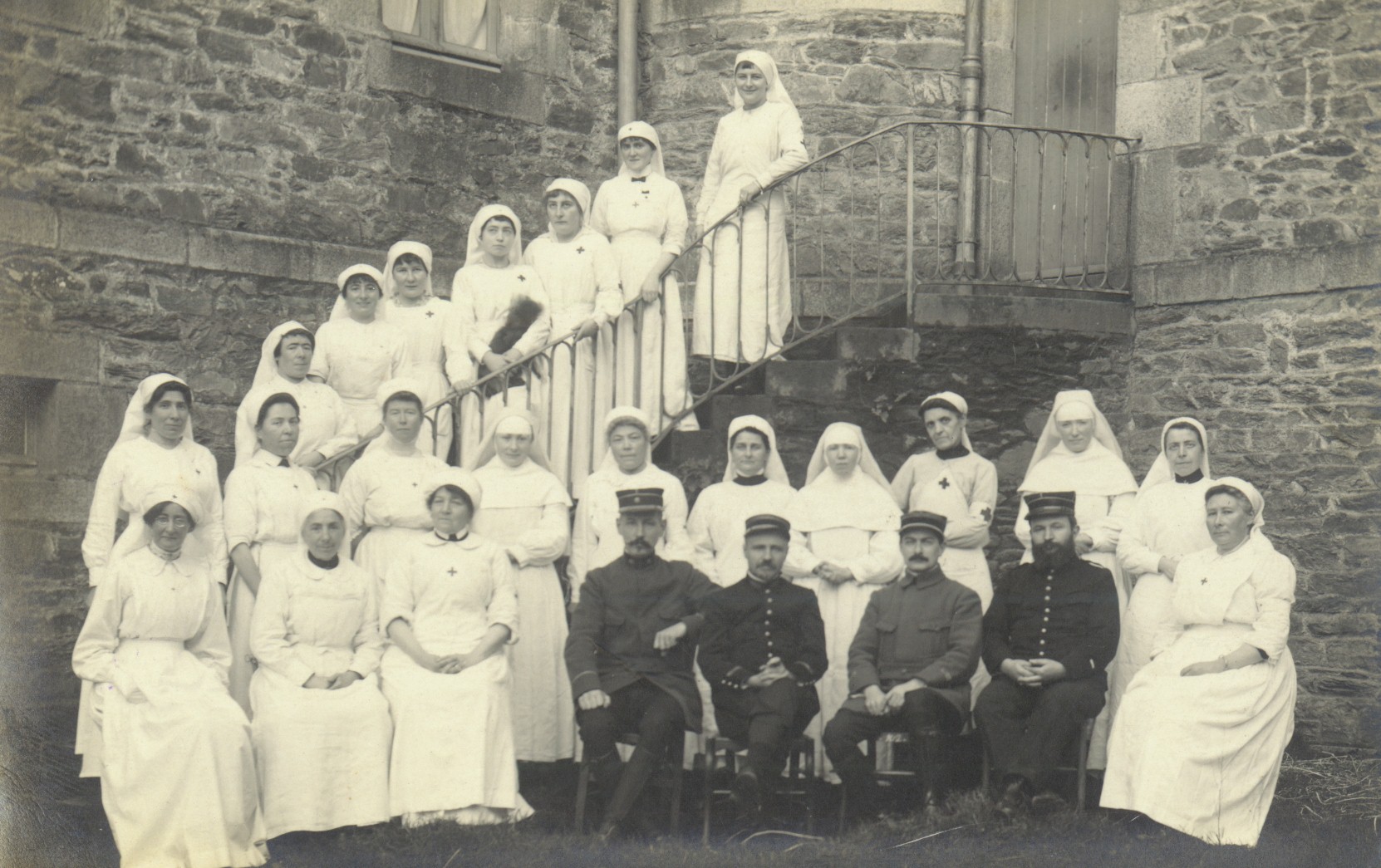Tréguier : petit séminaire, personnel de l'hôpital complémentaire dans la cour nord (infirmières et médecins), vers 1914-1918 (collection iconographique réunie par Michel Le Cam, ancien professeur au Lycée Joseph Savina)Immatriculation