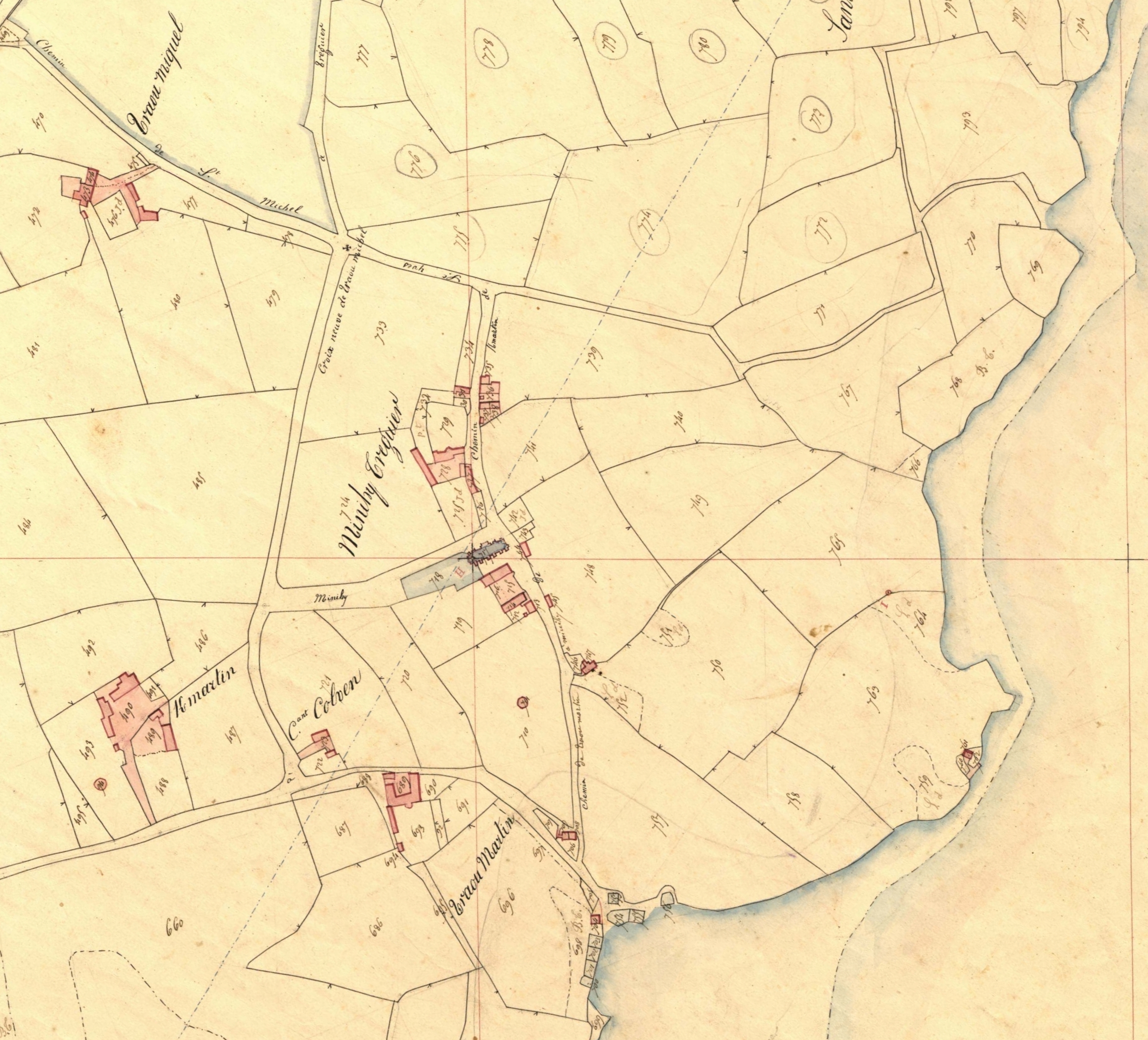 Extrait du cadastre ancien de Minihy-Tréguier, section A3 dite de Saint-Yves, 1835 : bourg de Minihy ; "Traou Miquel" ; "Kermartin" ; "Convenant Colven" ; "Traou Martin"Immatriculation