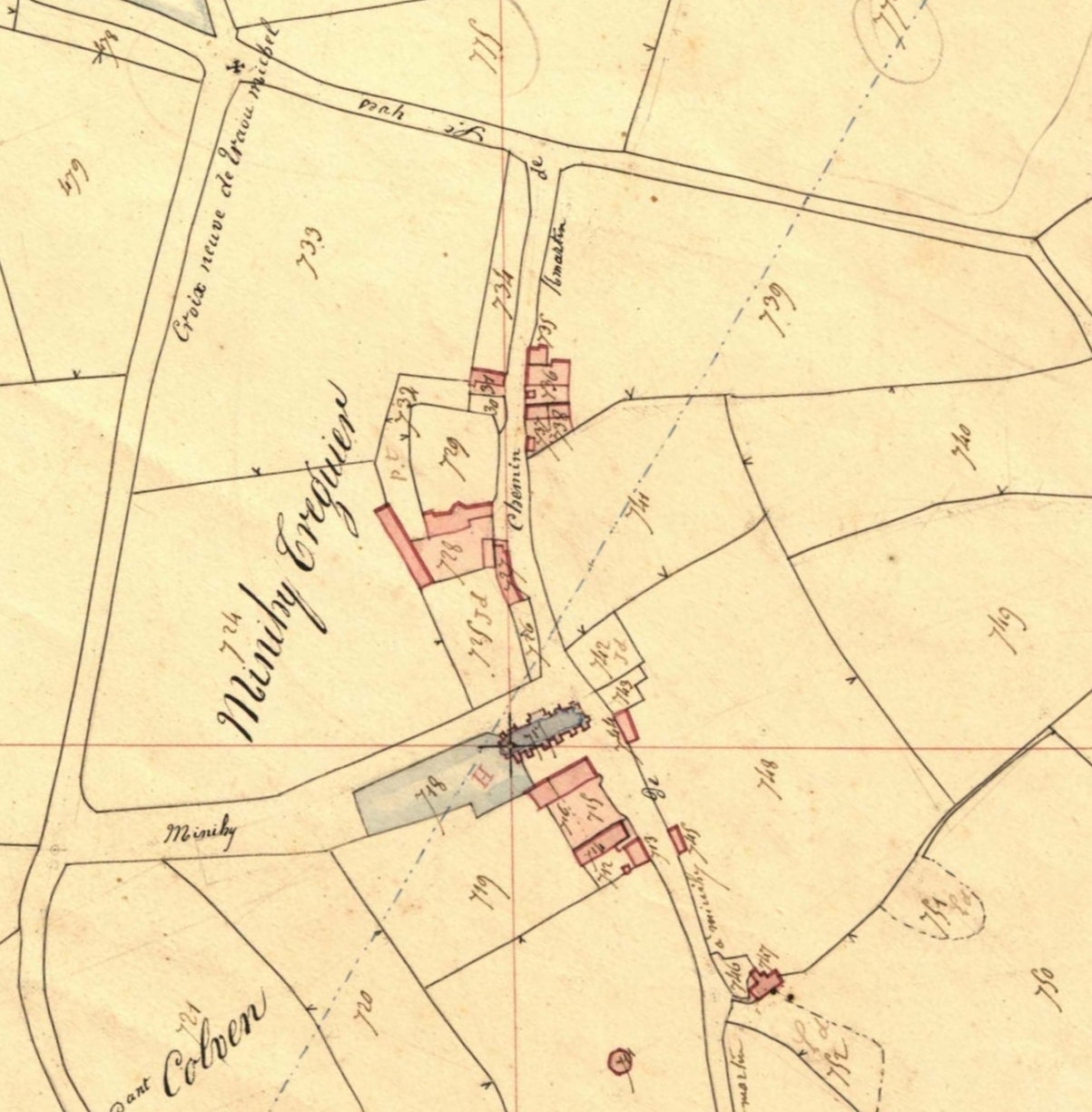 Extrait du cadastre ancien de Minihy-Tréguier, section A3 dite de Saint-Yves, 1835 : bourg de Minihy. Les parcelles sont désignées comme "chapelainie [sic] de Saint-Yves", "parc ar Houldry [champ du colombier], labour" (n° 710), "Le colombier, bâtiment" (n° 711), "jardin" (n° 712), "maison" (n° 713), "maison et cour" (n° 714), "maison et cour" (n° 715), "maison et cour" (n° 716), "Bourg de Minihy, jardin" (n° 719).Immatriculation