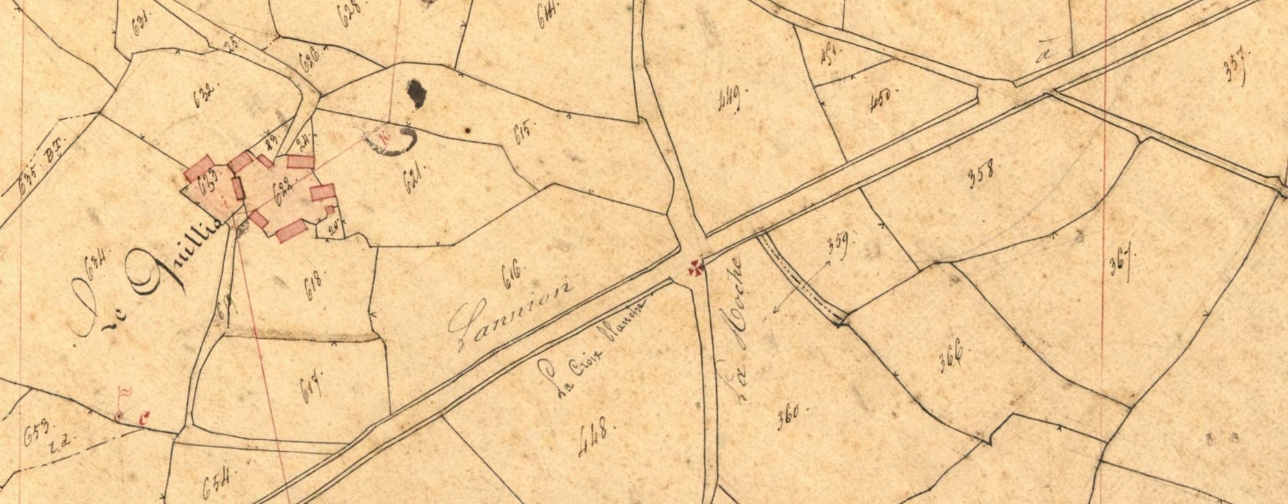 Extrait du cadastre ancien de Minihy-Tréguier, section C2 dite de Kermoal, 1835 : "Le Quillio" ; "La Croix Blanche"Immatriculation