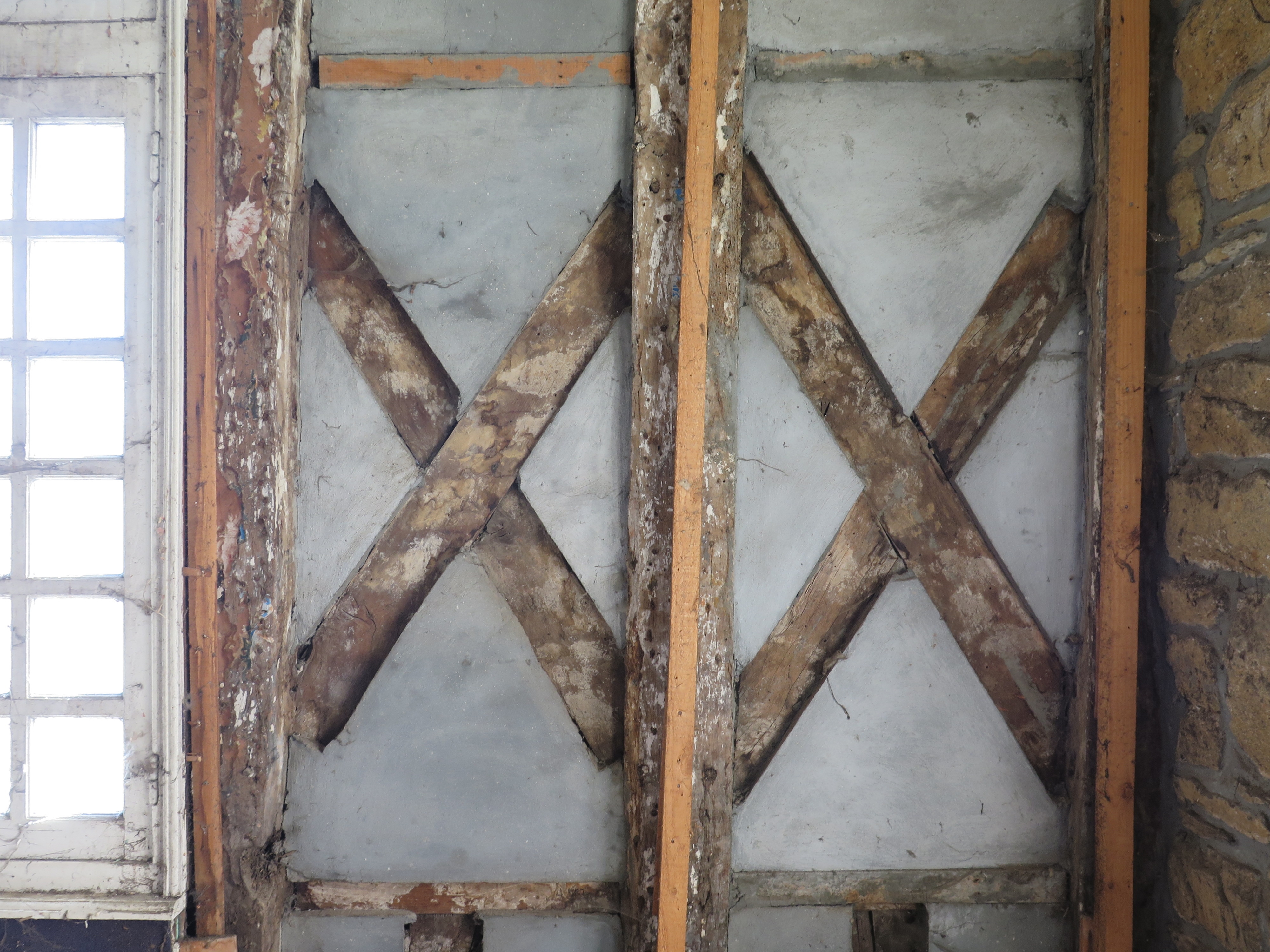 Tréguier, rue Renan - quai du Jaudy (7 place du Général de Gaulle) : maison d'armateur ou de négociant, premier étage, détail du pan de bois (visite réalisée le 11 avril 2017 avec la mairie de Tréguier)Immatriculation