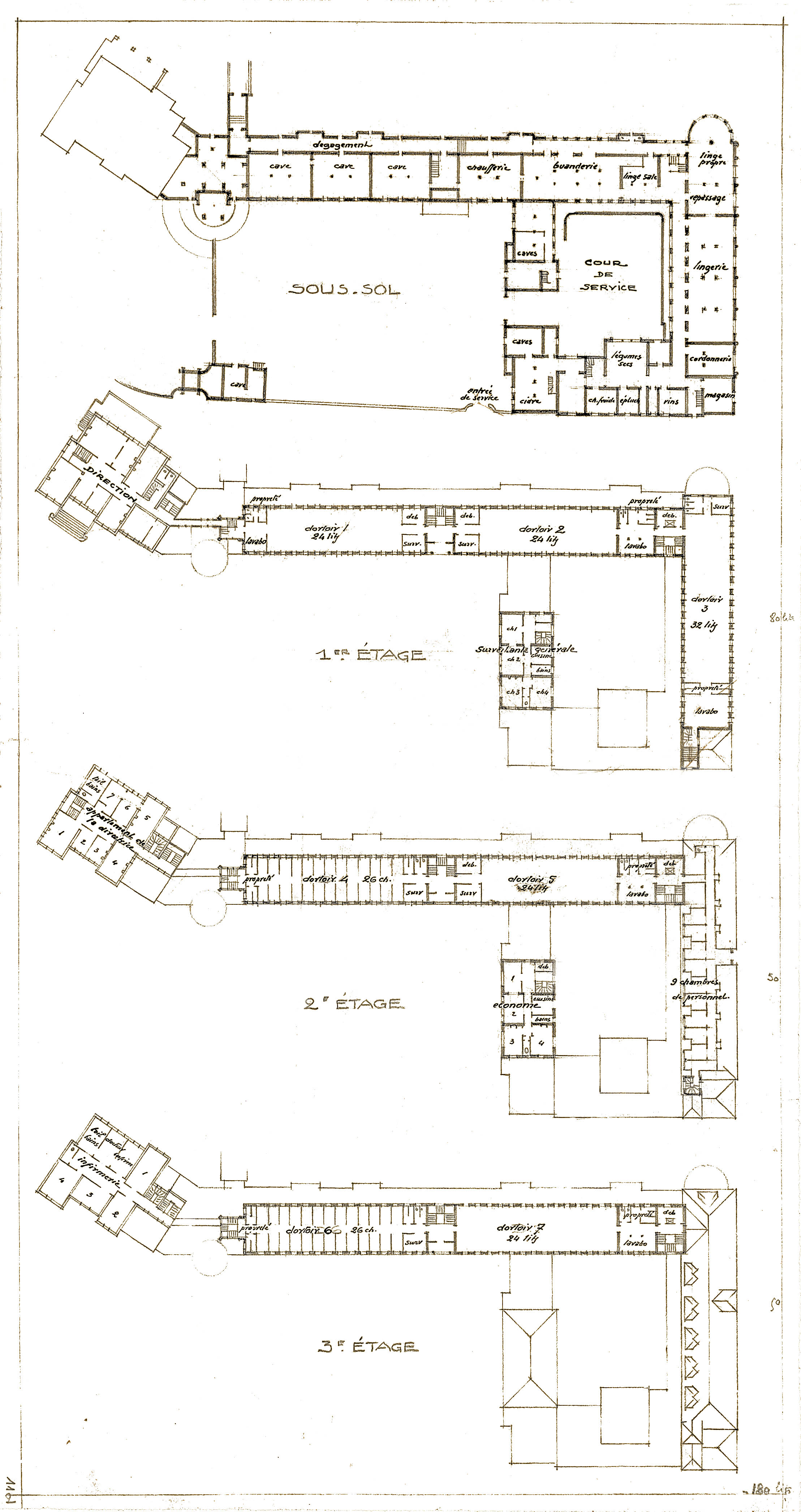 Plan des différents niveaux de la villa Baratoux, de l'internat, de l'économat, du réfectoire, des cuisines et de la loge. G-R. Lefort, architecte (sd. ca 1936)Immatriculation