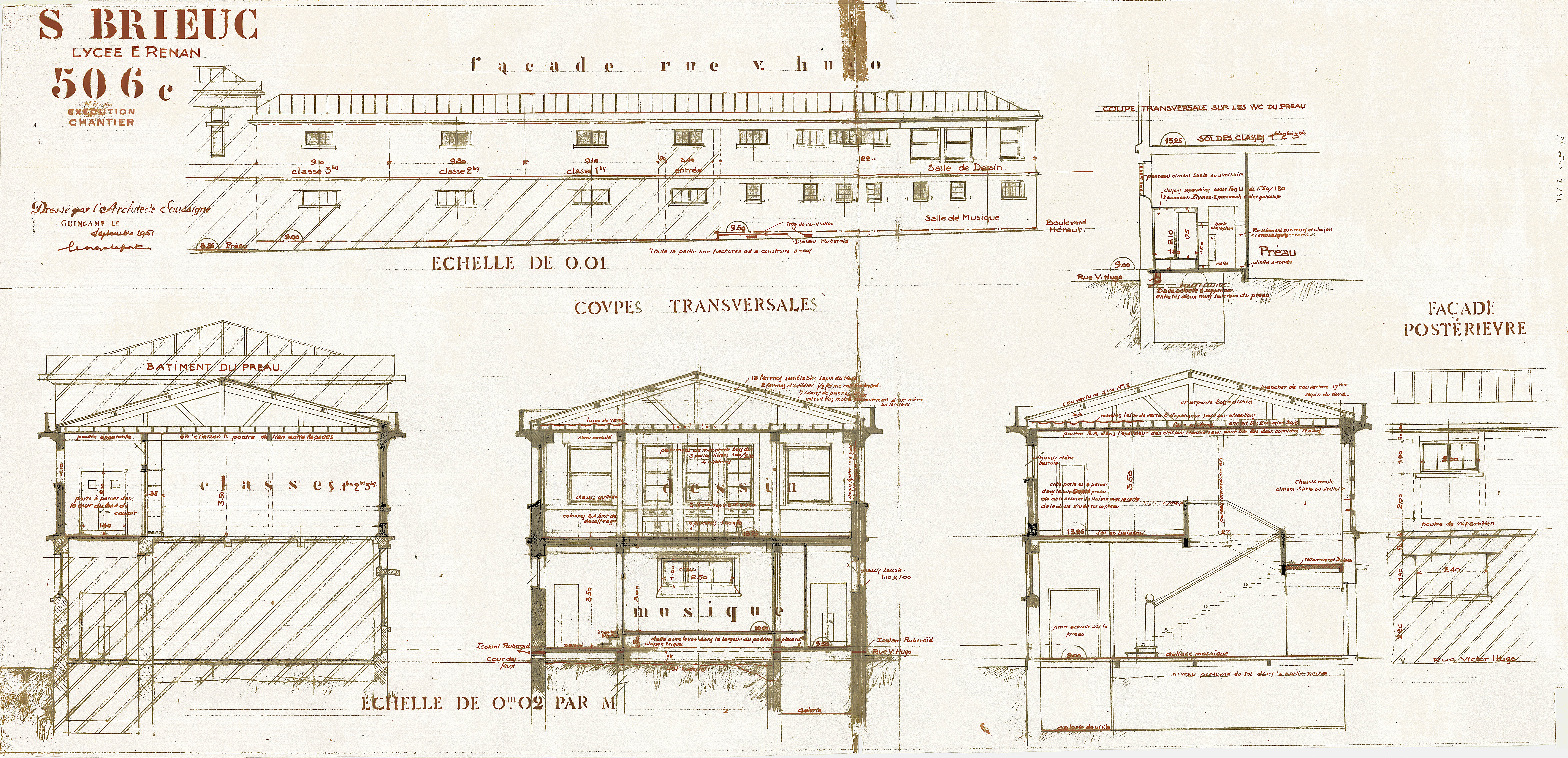 Extension 1951 : coupes transversales et façade sur la rue Victor Hugo. G-R. Lefort, architecte, septembre 1951.Immatriculation
