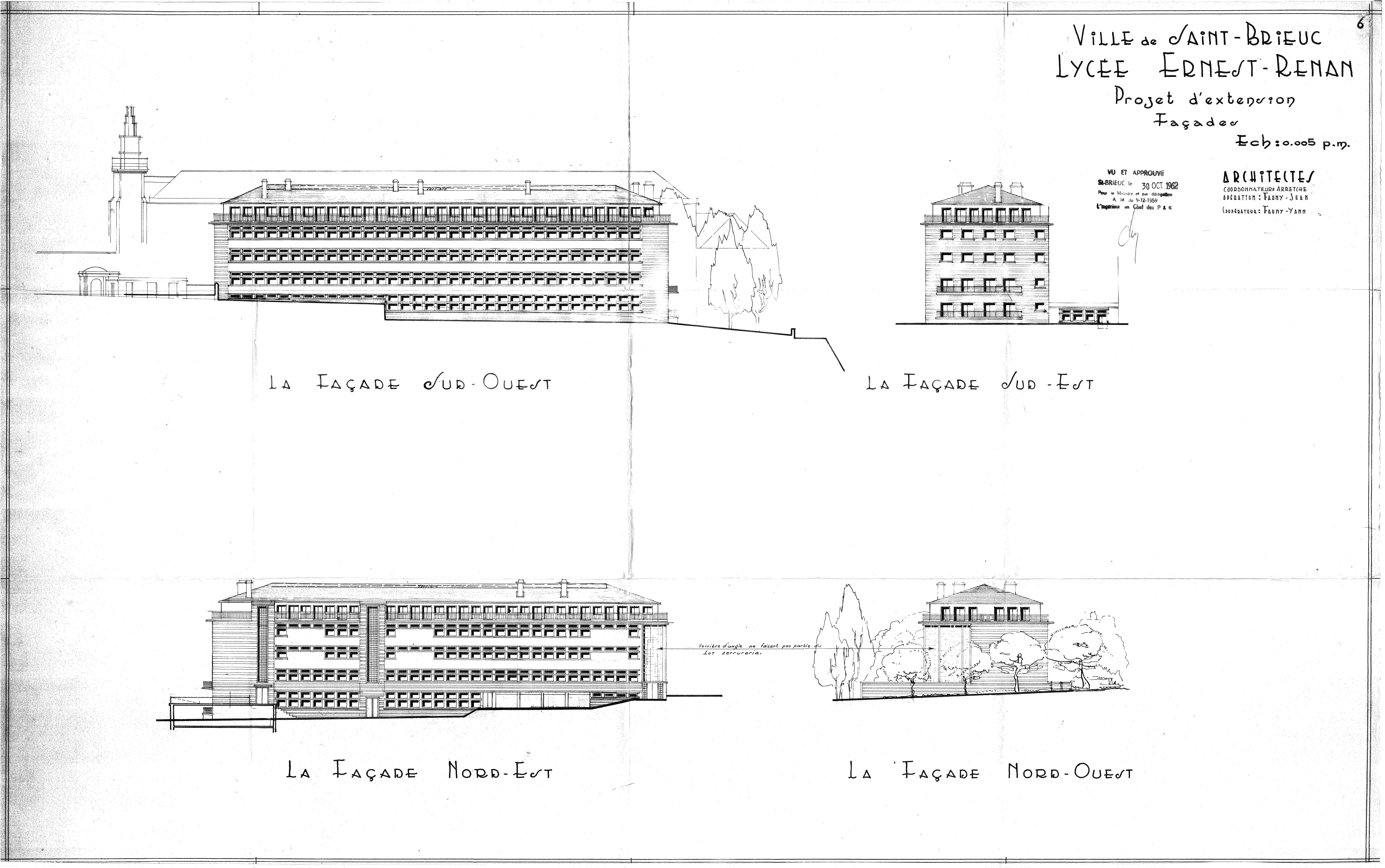 Projet d'extension. Façades. Coordonnateur : Arretche ; opération Jean fauny , Collaborateur Yann Fauny. Vu et approuvé par l'ingénieur en chef des P et C, par délégation du ministre, le 30 oct 1962.Immatriculation