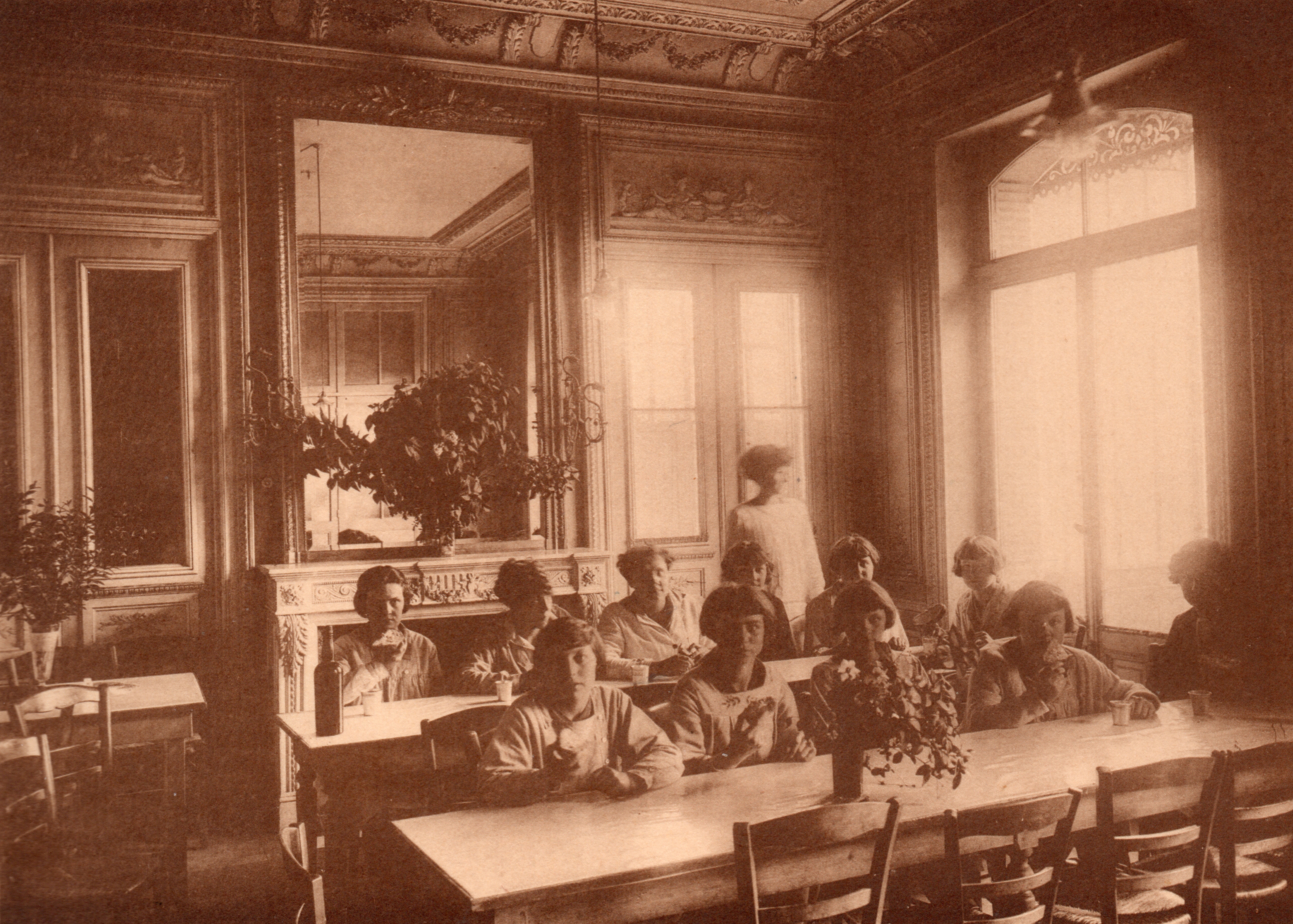 Le réfectoire dans les années 1920. Il est installé dans le salon d'honneur de la villa Baratoux, actuelle salle de réunion du conseil d'administration du lycée.Immatriculation