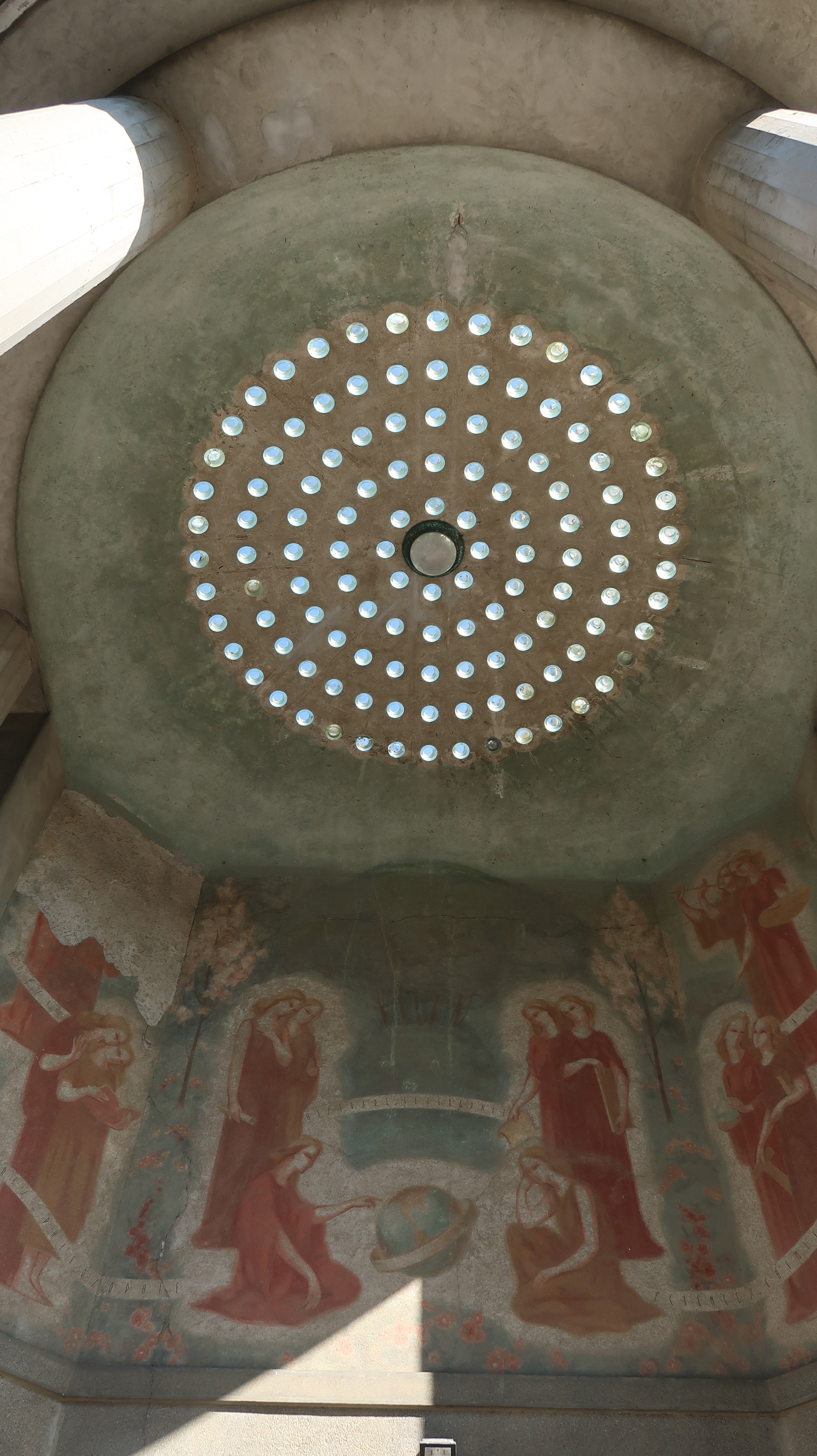 Vue sur le puits de lumière de la rotonde et sur la peinture murale de Théophile Lemonnier : "Poésie - Lettres - Philosophie - Histoire - Géographie - Sciences - Chimie - Physique - Arts"Immatriculation