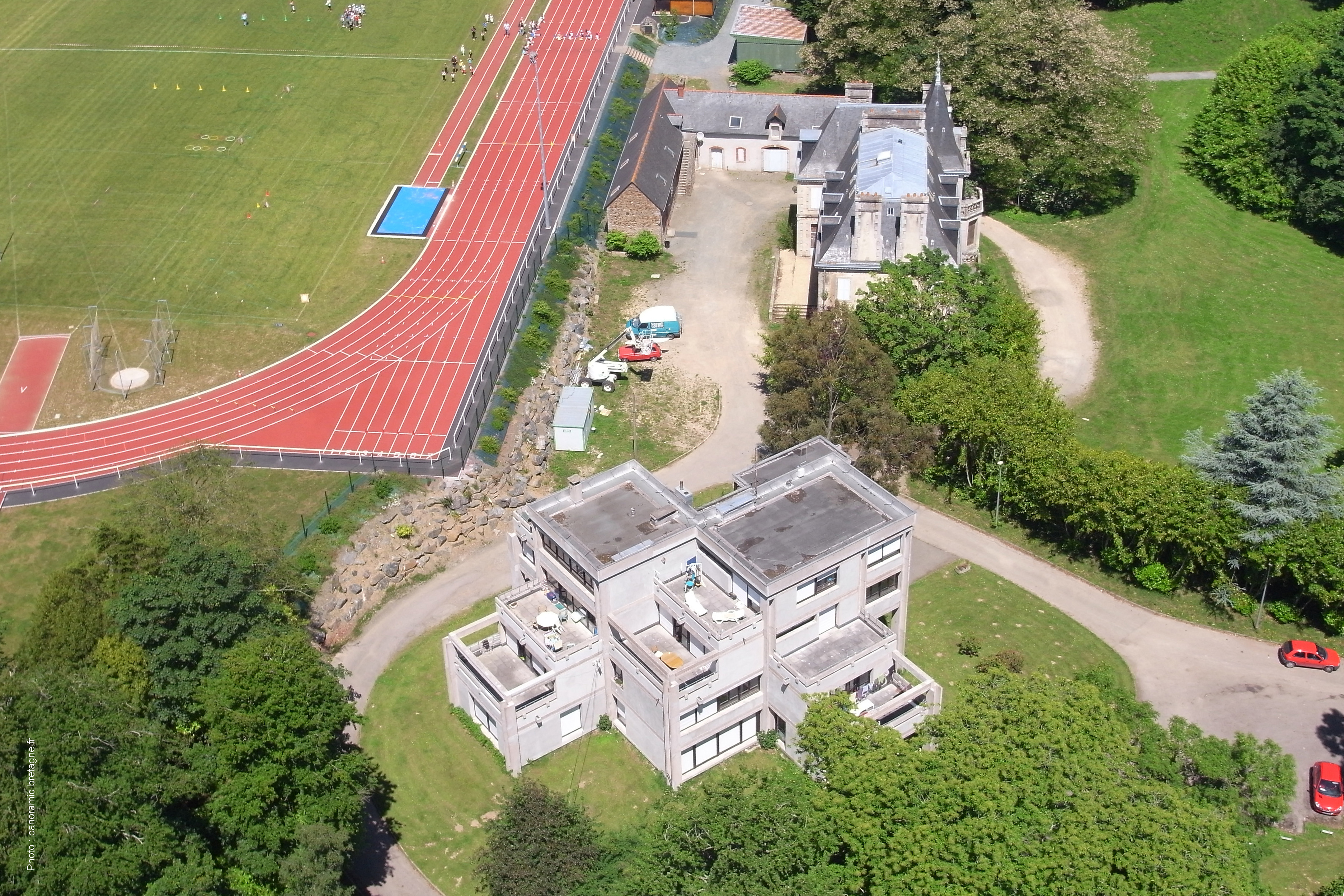 Vue aérienne des logements de fonction, du "château" (maison de notable) de Kerraoul et des communs.Immatriculation