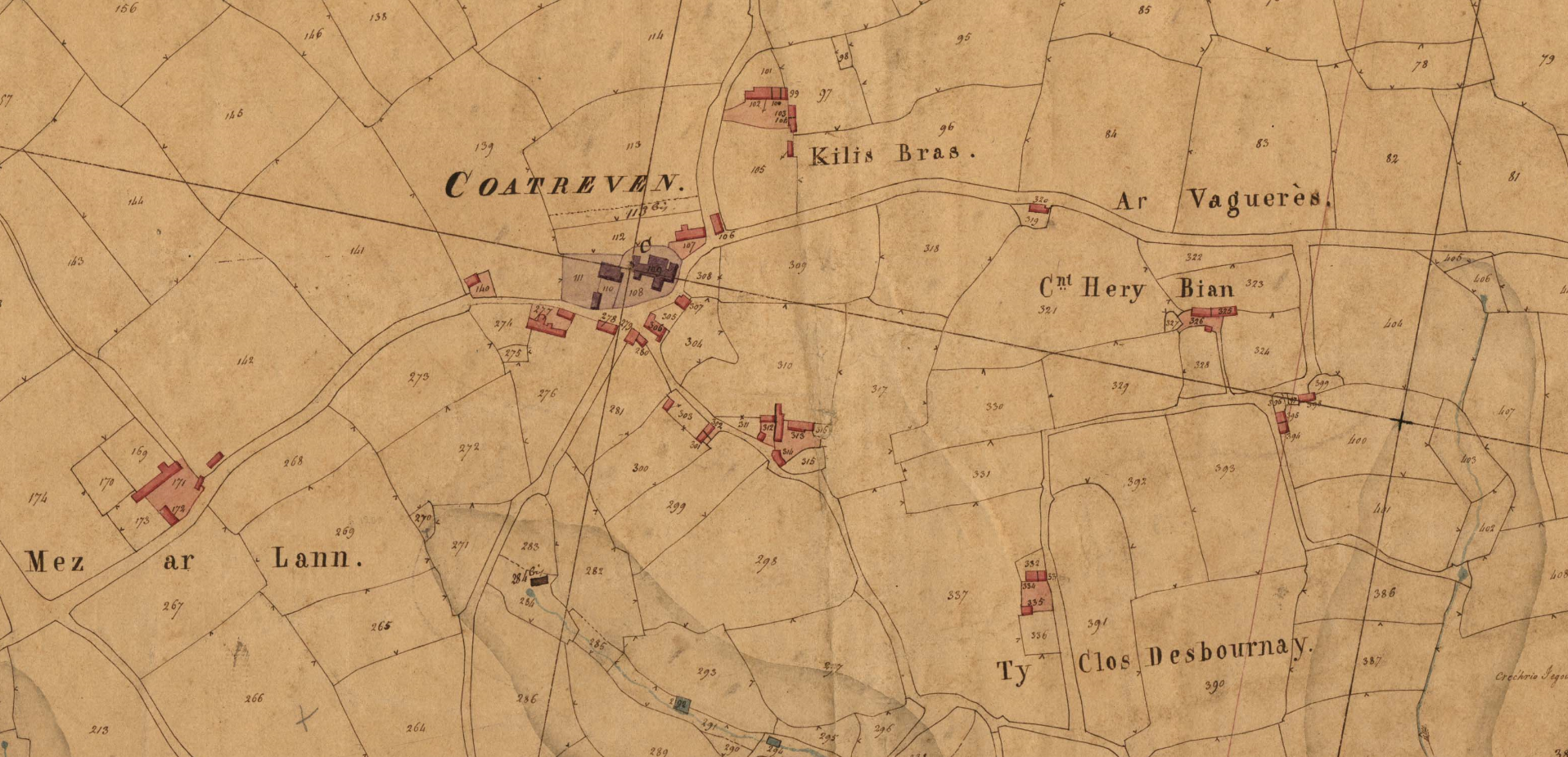 Extrait du cadastre ancien de la commune de Coatréven. Section A dite du Bourg, première feuille, 1834Immatriculation