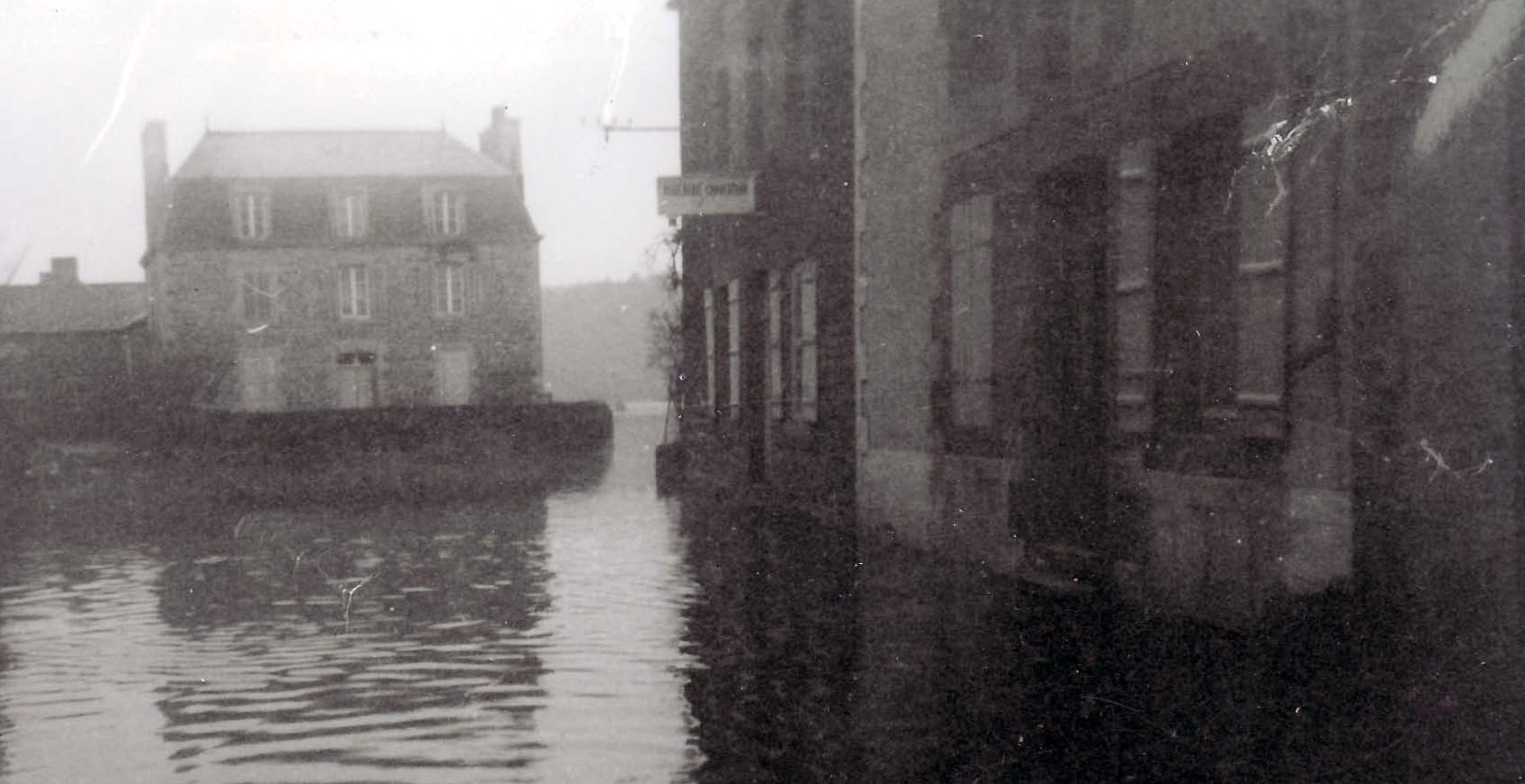 Photo prise vers 1950, les inondations à Mordreuc devant la maison de Jean-Marie Lorre construite en 1888 (A. privées Germaine Guillou)Immatriculation