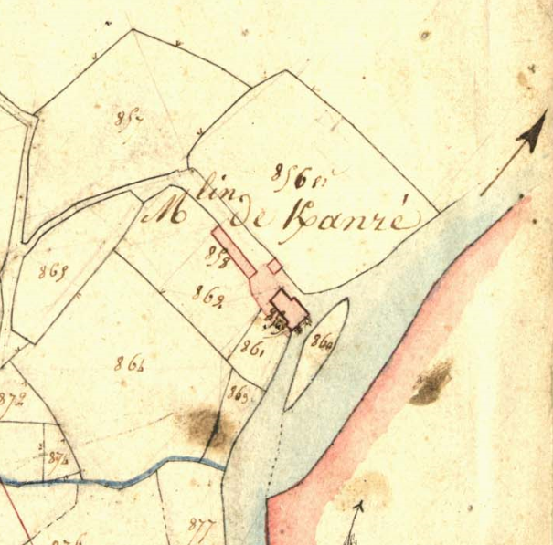 Extrait du cadastre de 1835 de la commune de Le Vieux-Marché, section B2 : Moulin de Keranré (Archives départementales des Côtes-d'Armor, série 3 P 387)Immatriculation