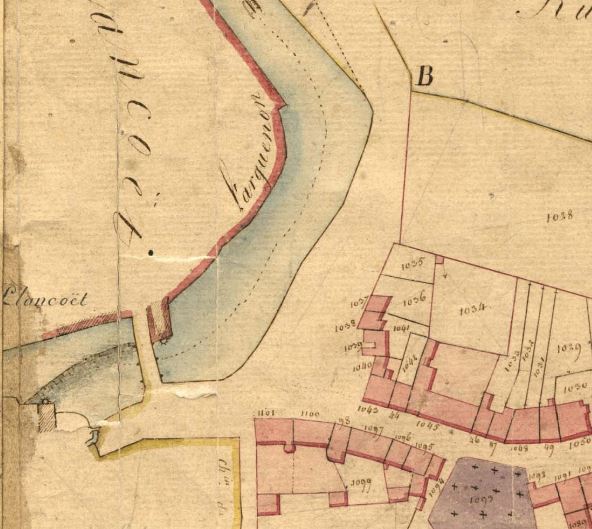 Extrait du cadastre ancien de 1827 représentant le bâti autour du port de Plancoët. Le bâti se concentre le long de la rue de l'Abbaye et sur la place.Immatriculation