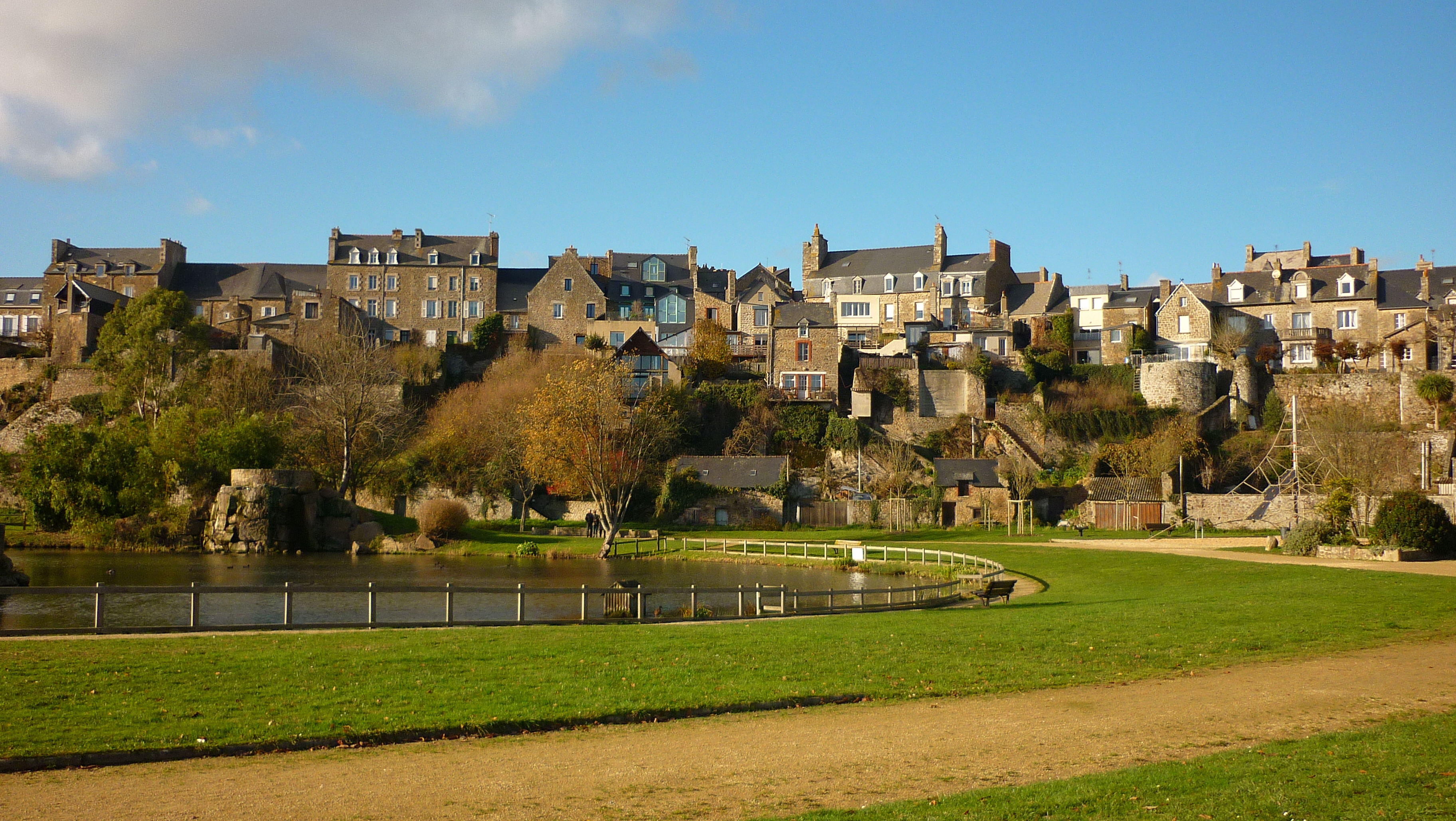 Vue depuis le parc du Pré Rolland vers la ville avec ses anciennes fortifications et les anciennes tanneries au bord de l'Arguenon.Immatriculation