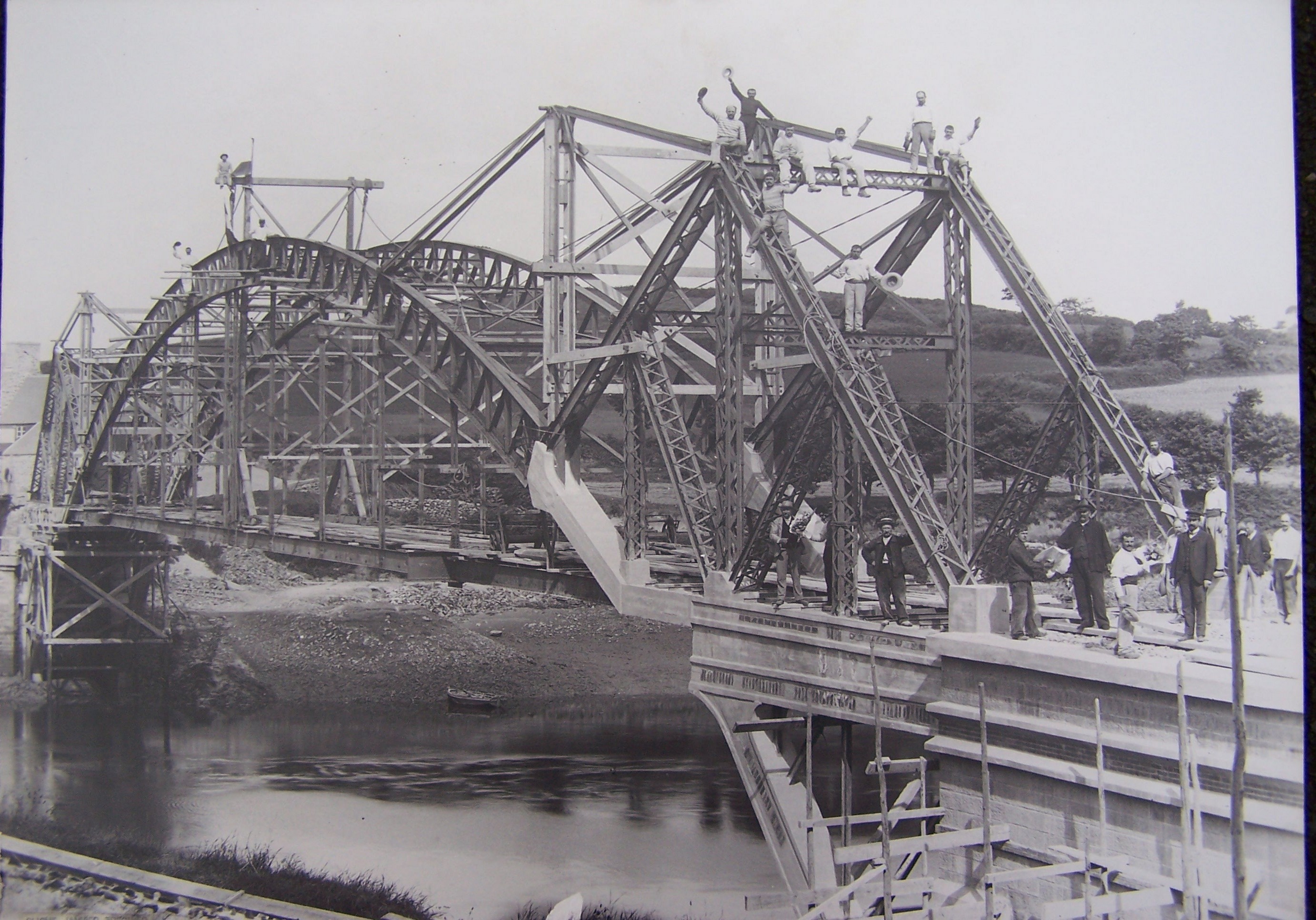 Ligne Tréguier - Perros-Guirec, viaduc du Guindy, 1905, les ouvriers de l’entreprise Nantaise de Travaux Métalliques, Arthur Trébuchet en charge de l’arc métallique, prennent la pose. Notez les conditions de sécurité ! (collection réunie par Michel Le Hénaff)Immatriculation