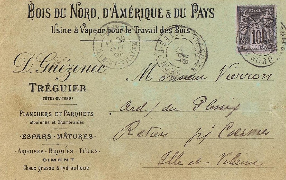 Tréguier : établissements Guézénec, envoi à client avec en-tête énumérant les activités, carte postale (collection particulière)Immatriculation