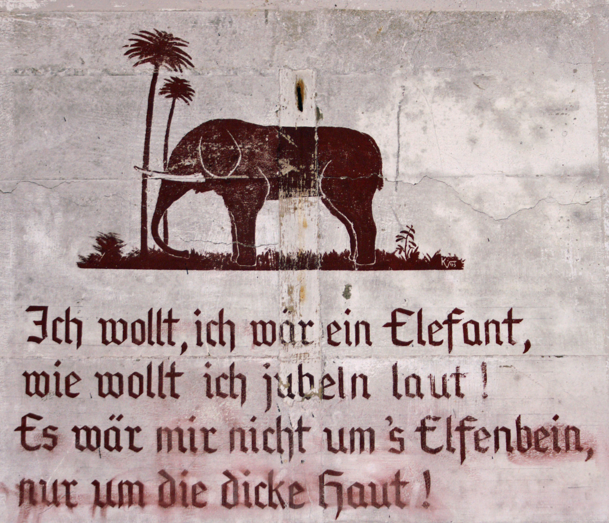 Fresque allemande signée KV.43, dans le casernement d’une casemate pour canon type 611. On peut traduire : "J’aimerais être un éléphant, ainsi pourrais-je jubiler à pleine voix ! Ce ne serait pas pour l’ivoire mais pour l’épaisse carapace !" (traduction : Jean-Yves Bohée)Immatriculation